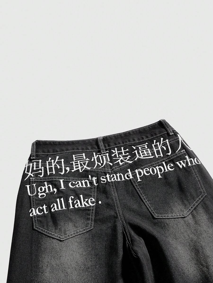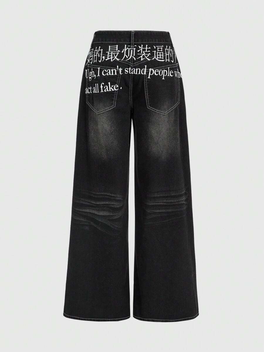 Grunge Punk Y2K Baddie Street Style Chinese & English Slogan Embroidered Loose Wide-Leg Jeans For Women