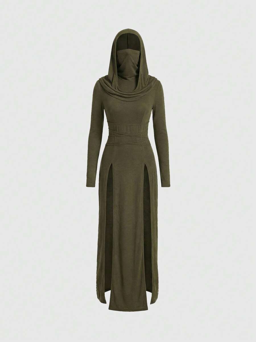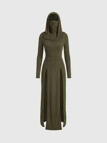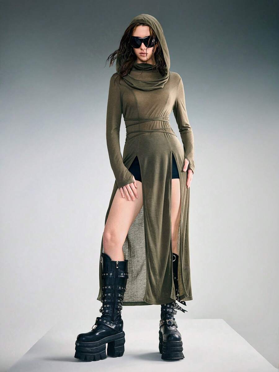 Grunge Punk Y2K Millennium Retro Apocalyptic Hooded Plunging Neckline High Slit Dress