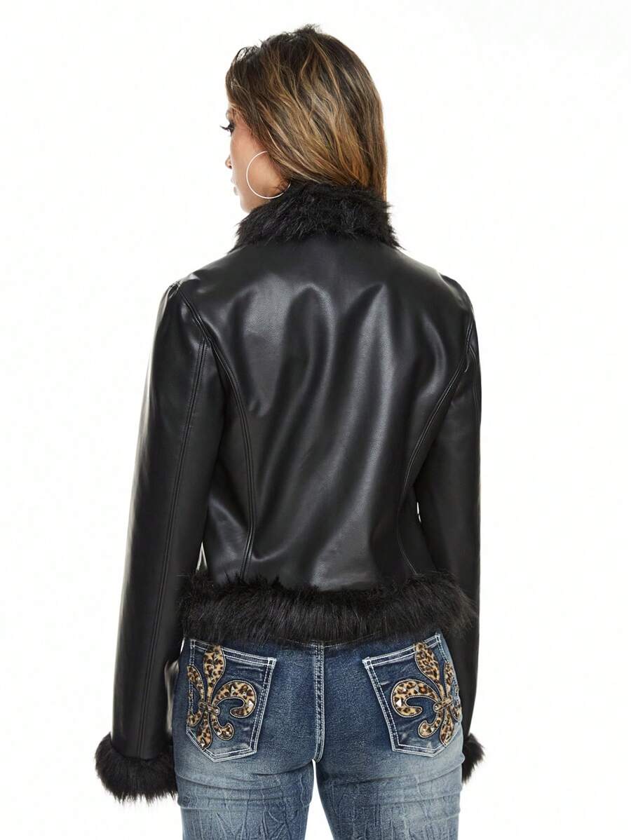 Grunge Punk Y2K Modern Chic Furry & Faux Leather Cinched Waist Jacket, Snow For Women