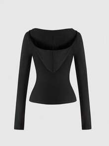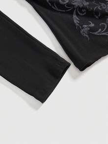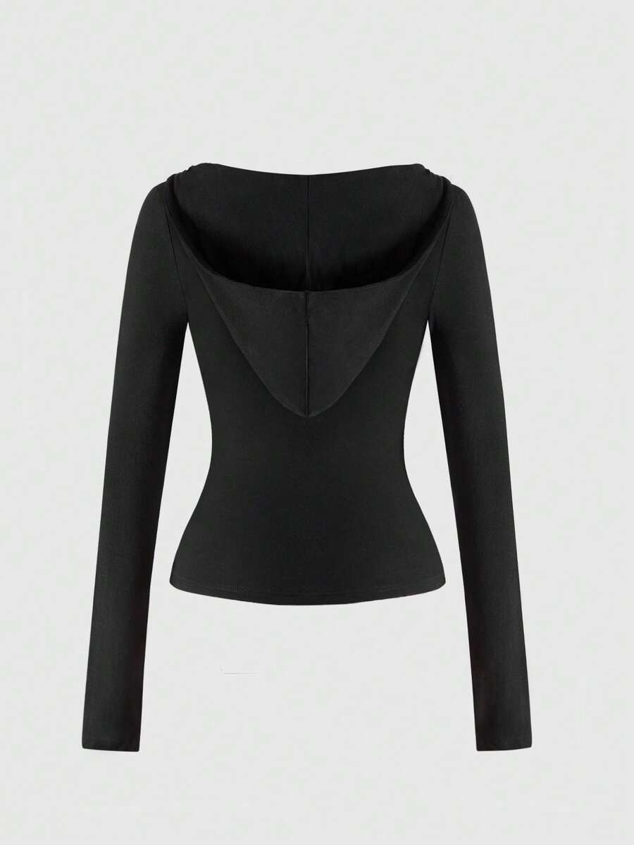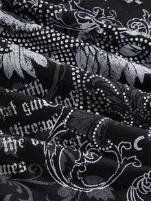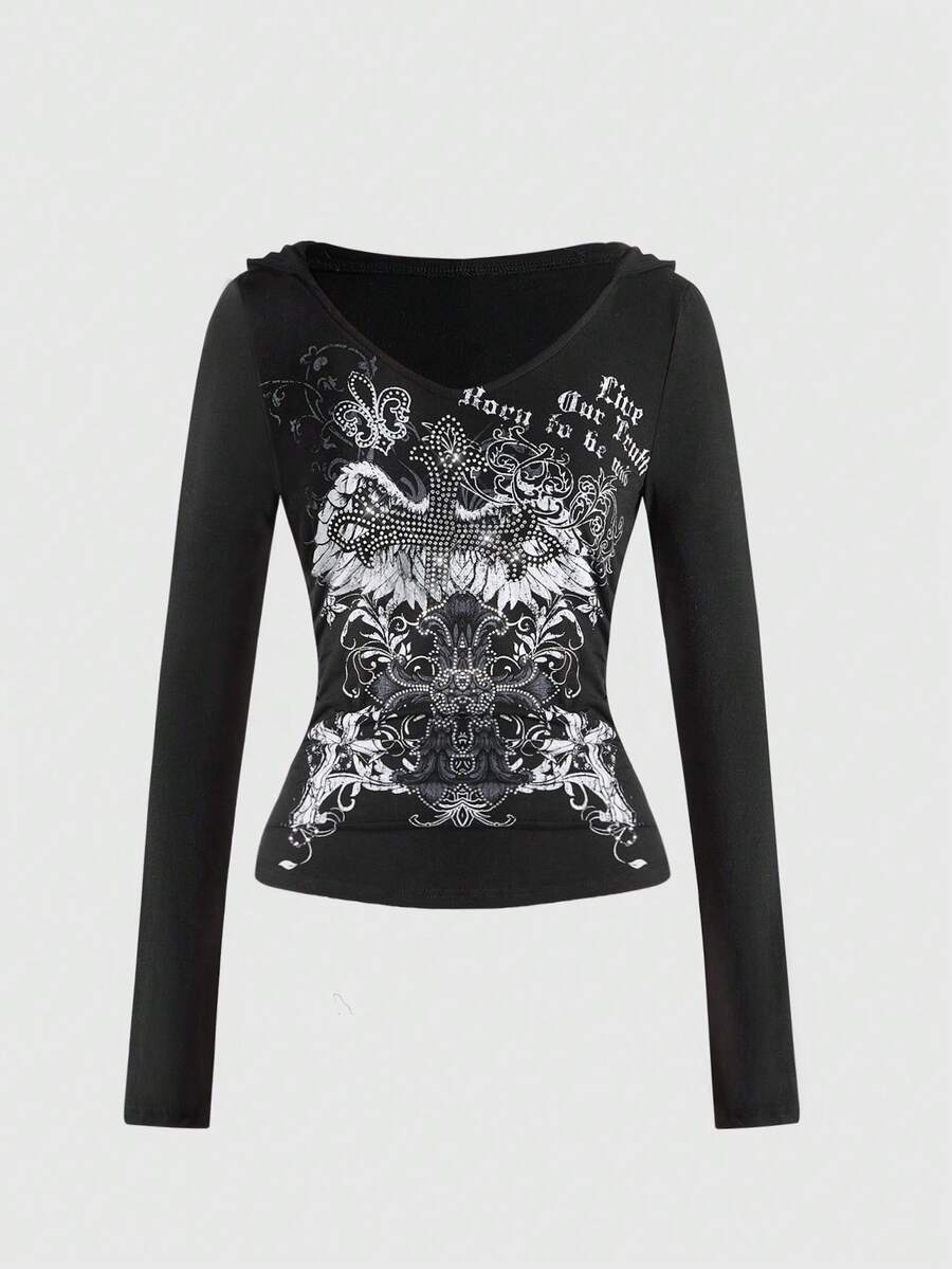 Grunge Punk Y2K Sexy Cross & Vine Print Rhinestone Embellished V-Neck Fitted Hoodie T-Shirt