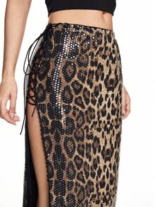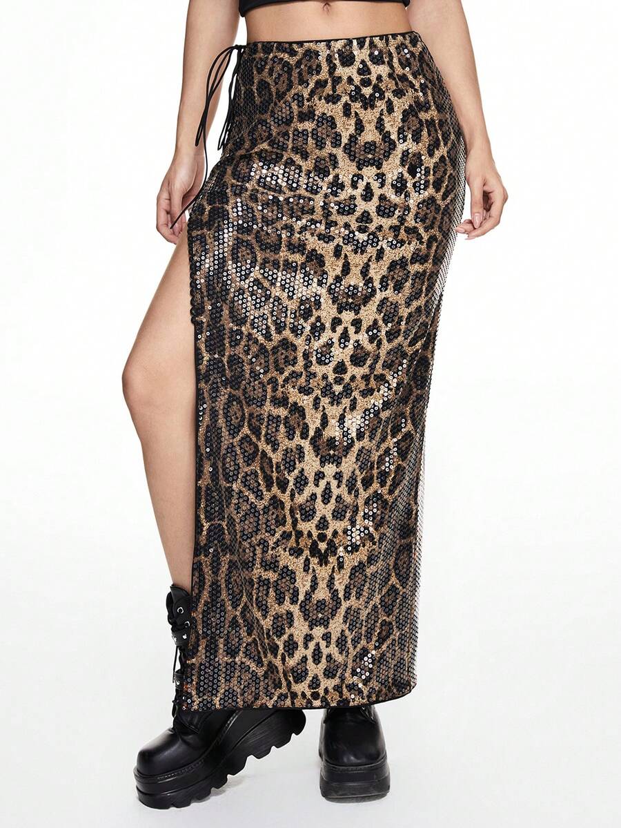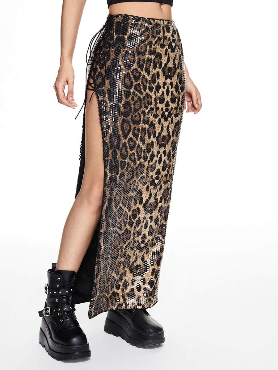 Grunge Punk Y2K Subculture Leopard Sequin Adjustable Side Tie Low Waist Bodycon Skirt For Women