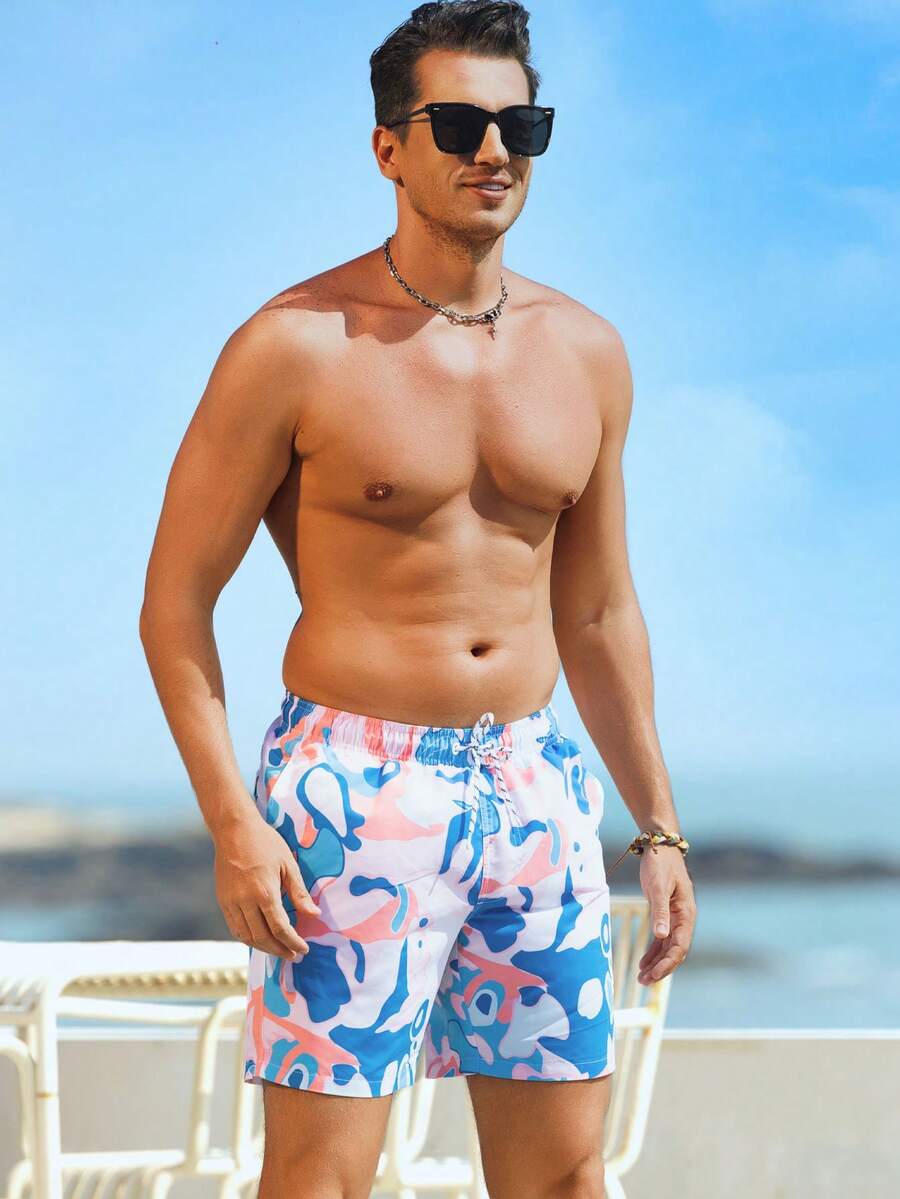 Guys Allover Print Letter Patched Drawstring Waist Swim Trunks