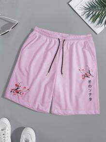 Guys Floral & Japanese Letter Graphic Drawstring Waist Shorts