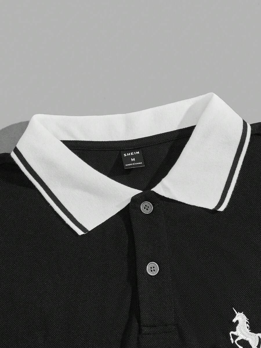 Guys Horse Embroidery Striped Trim Polo Shirt