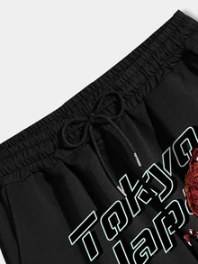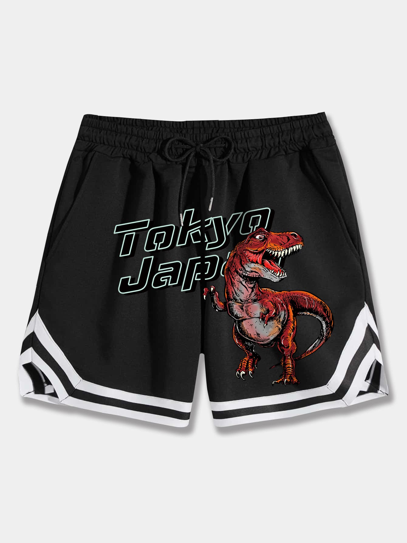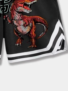 Guys Letter & Dinosaur Print Striped Trim Drawstring Waist Shorts
