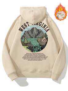Guys Mountain & Slogan Graphic Kangaroo Pocket Drawstring Thermal Hoodie
