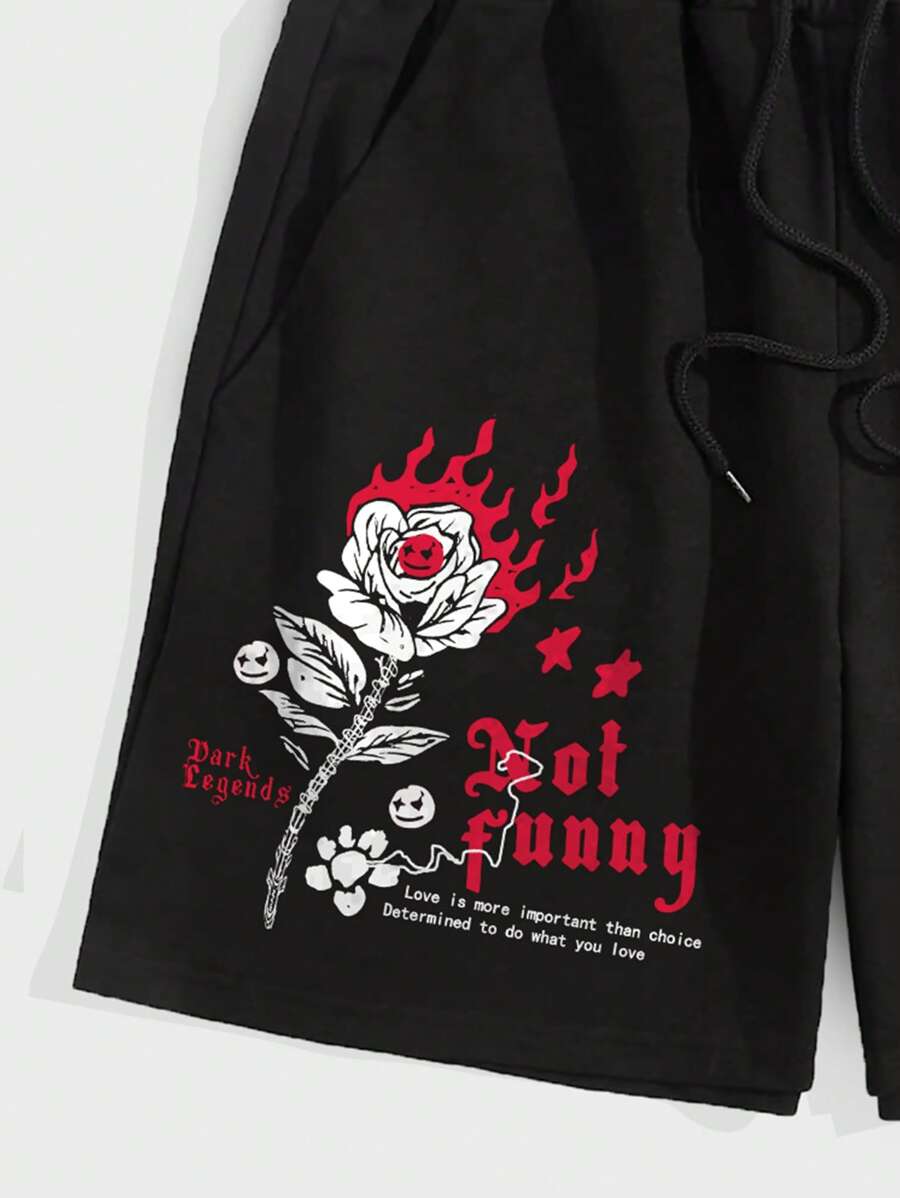 Guys Slogan & Cartoon Floral Graphic Drawstring Waist Shorts