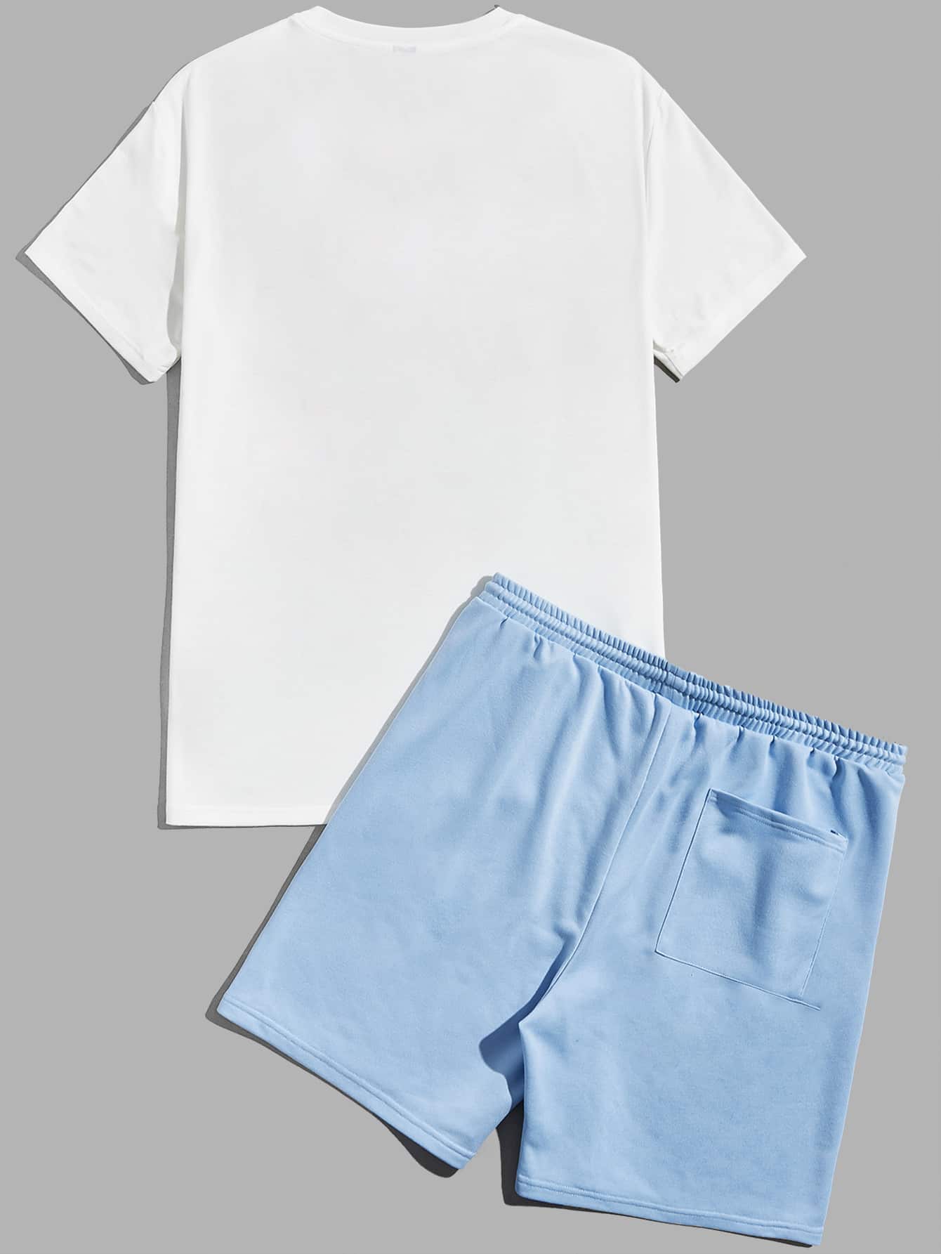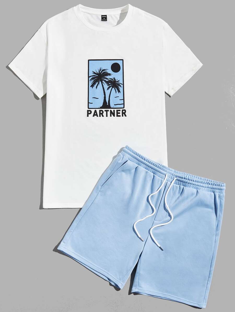 GENTILAND Guys Tropical & Letter Graphic Tee & Drawstring Waist Shorts