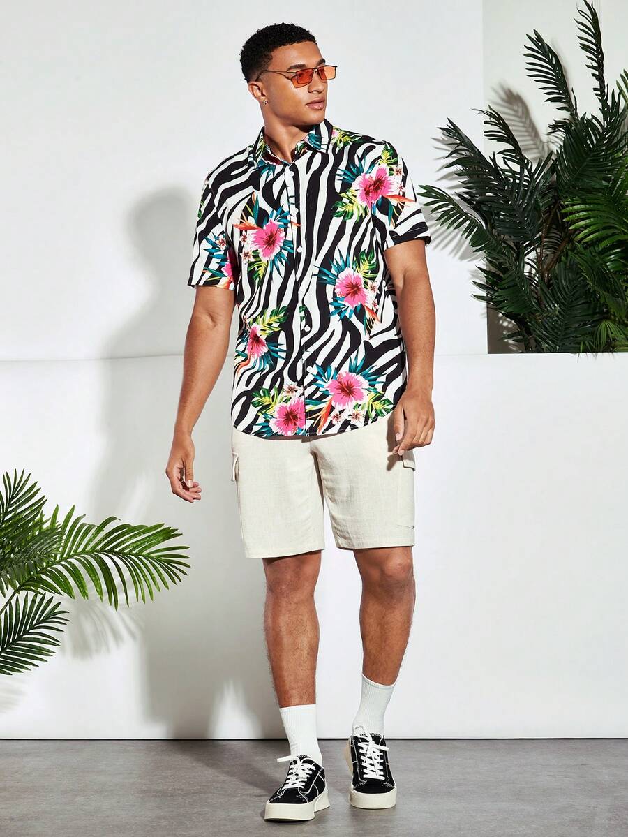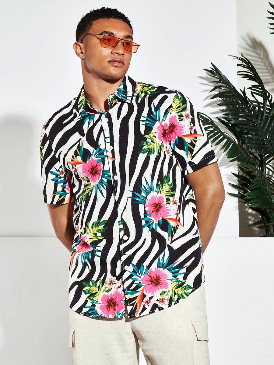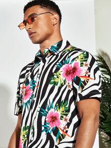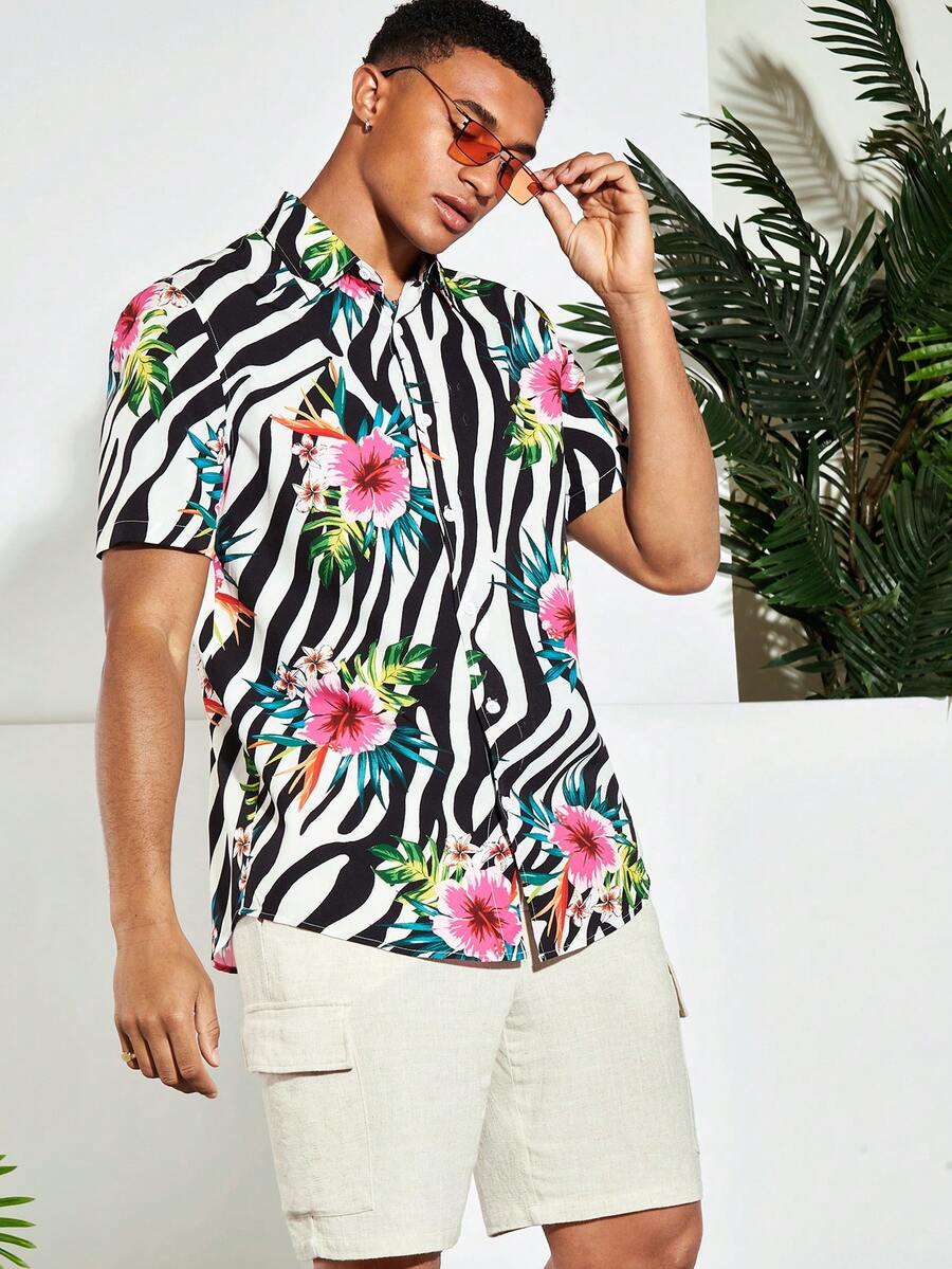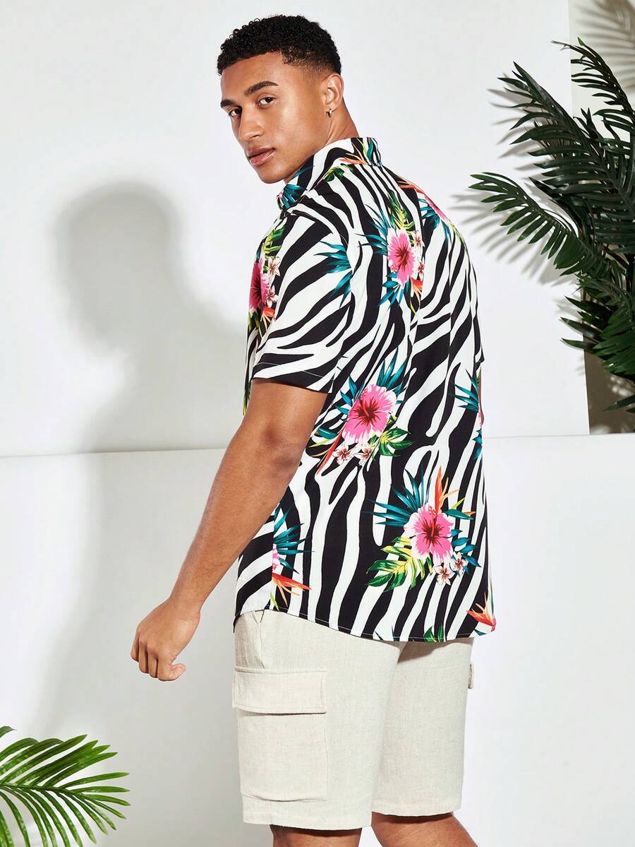 Guys Zebra Striped & Tropical Print Shirt