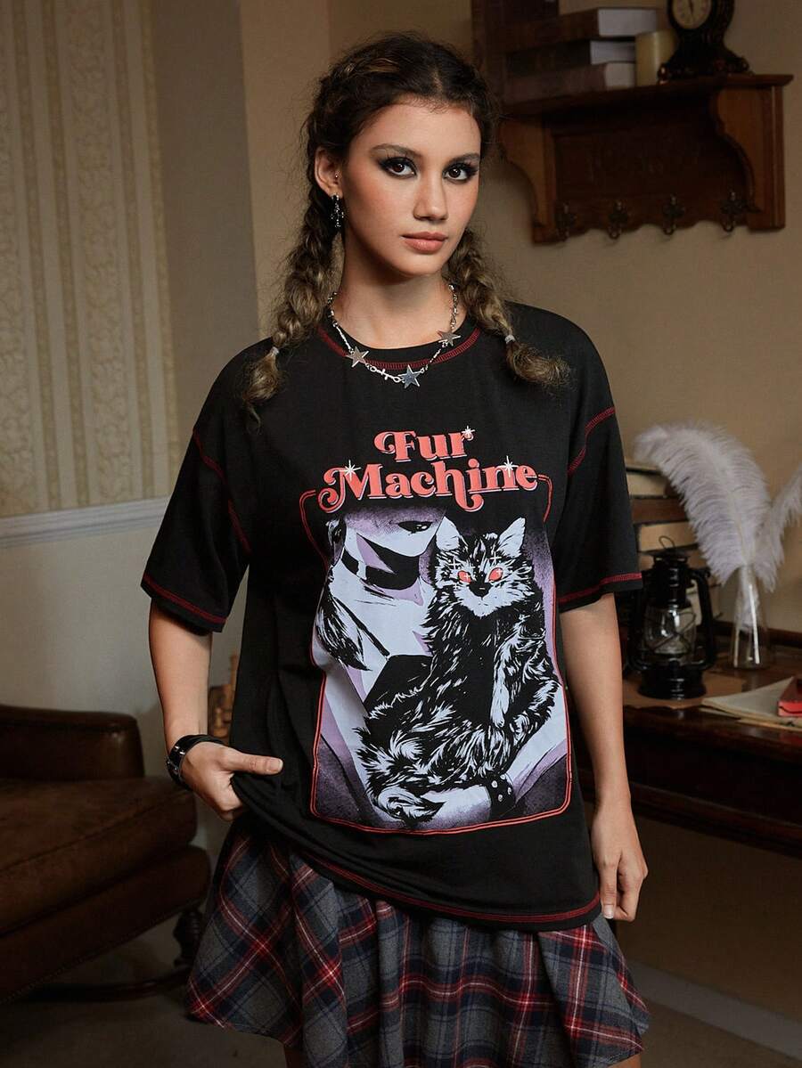 Hafaell Cat Print Top-stitching Drop Shoulder Tee
