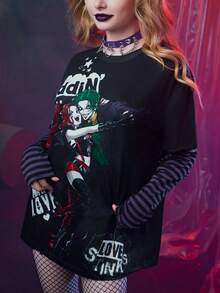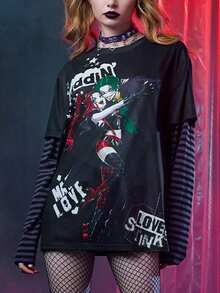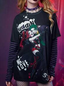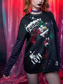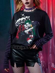 Harley Quinn | ROMWE 2 In 1 Striped Sleeve Letter Figure Graphic Tee