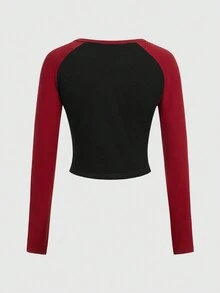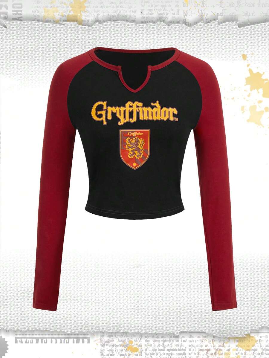 Harry Potter | ROMWE Contrast Raglan Sleeve Notched Neck Crop T-Shirt