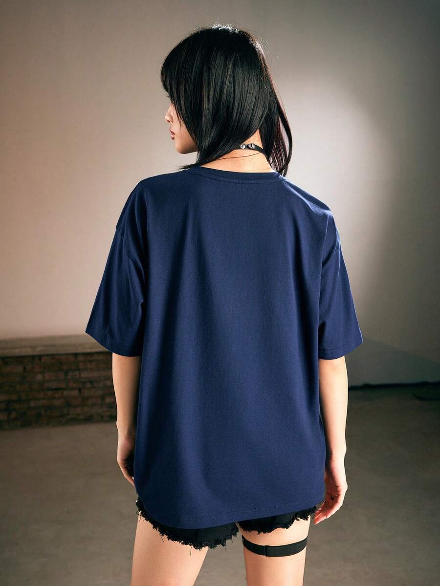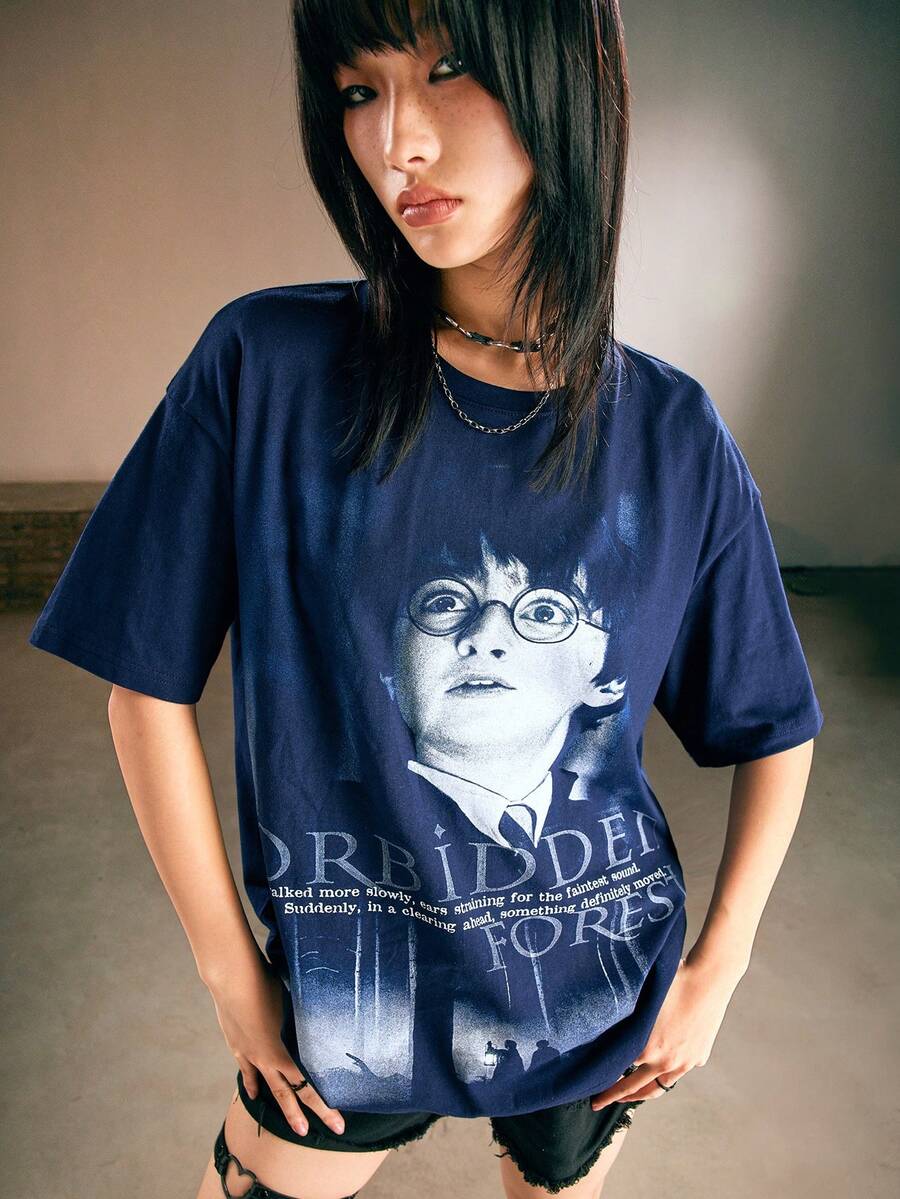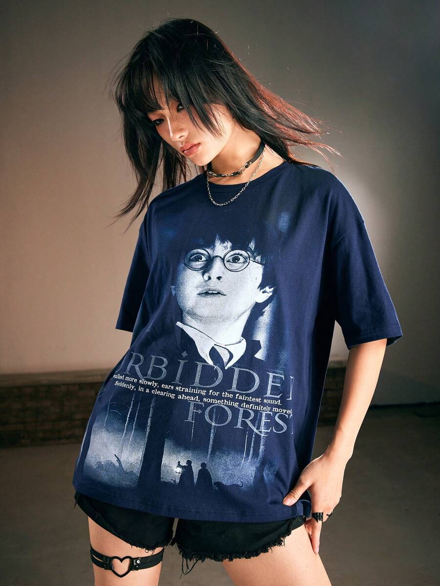Harry Potter | ROMWE Women's Slogan Print Drop Shoulder T-shirt With Movie Character Pattern