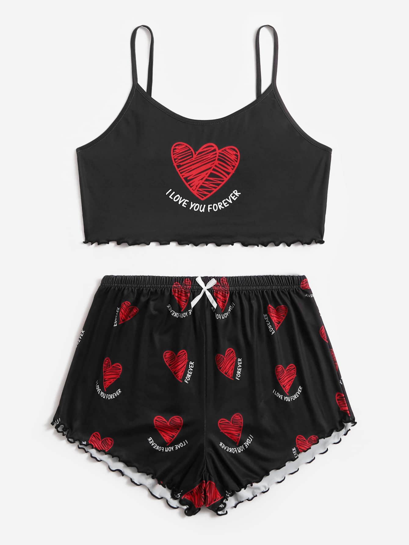 Heart And Slogan Graphic Lettuce Trim Cami Top & Shorts PJ Set