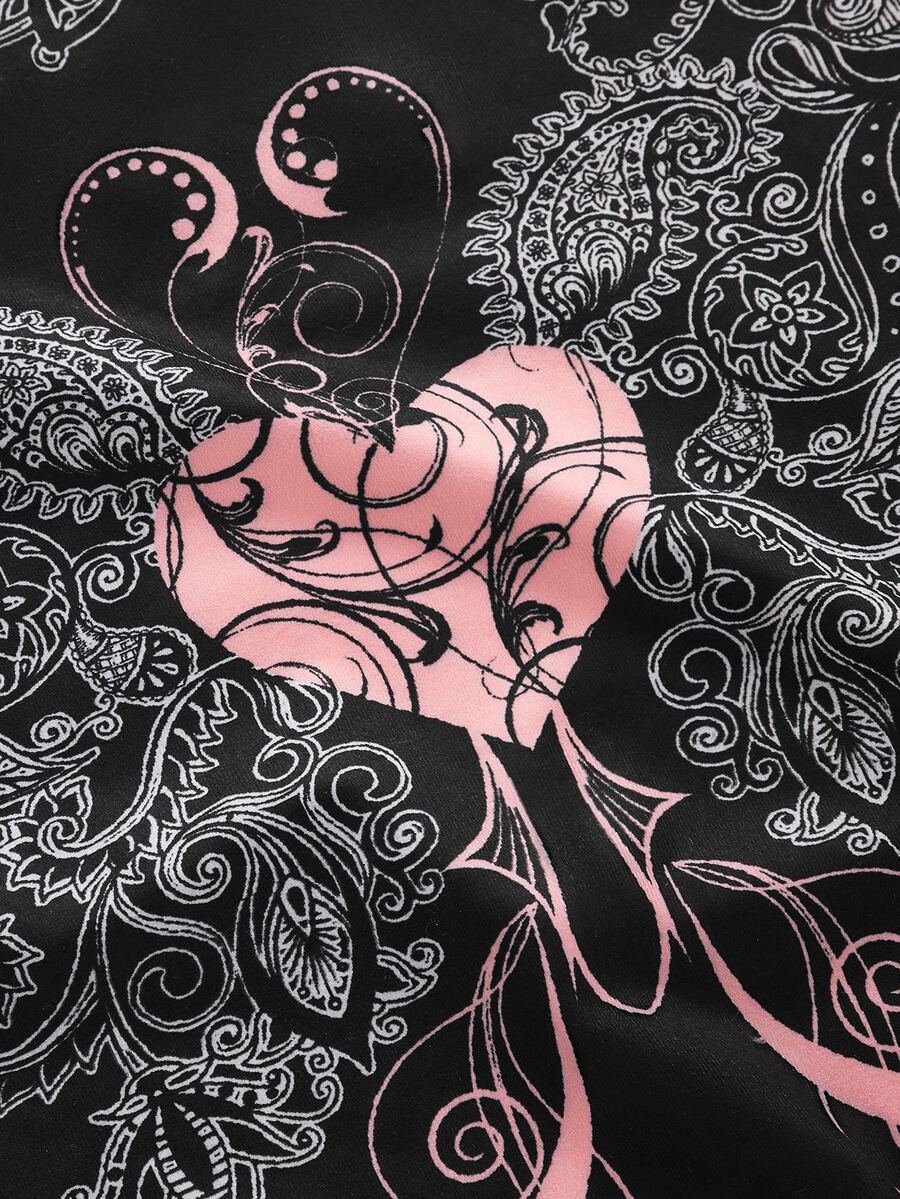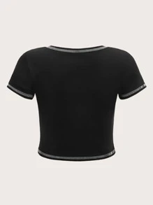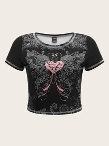 Heart & Scroll Print Top-stitching Crop Tee