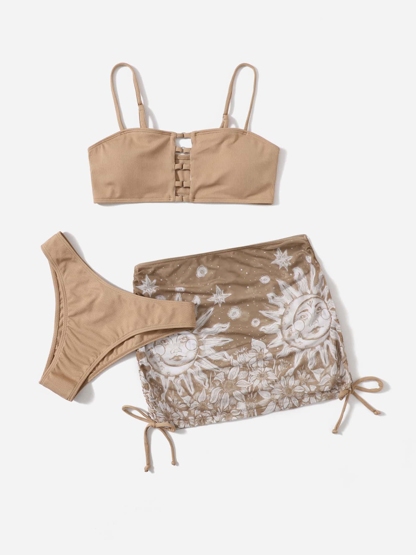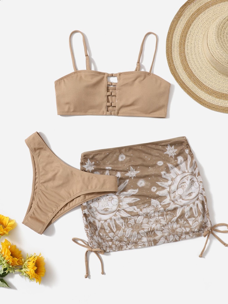 Herminedecrayon Goth Cut Out Bikini Set With Sun & Moon Graphic Beach Skirt, For Summer Vacation