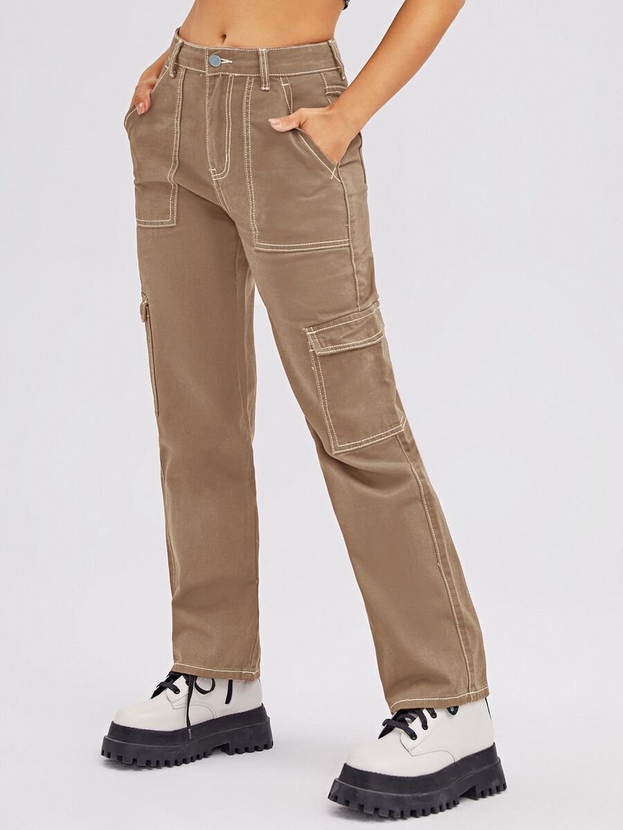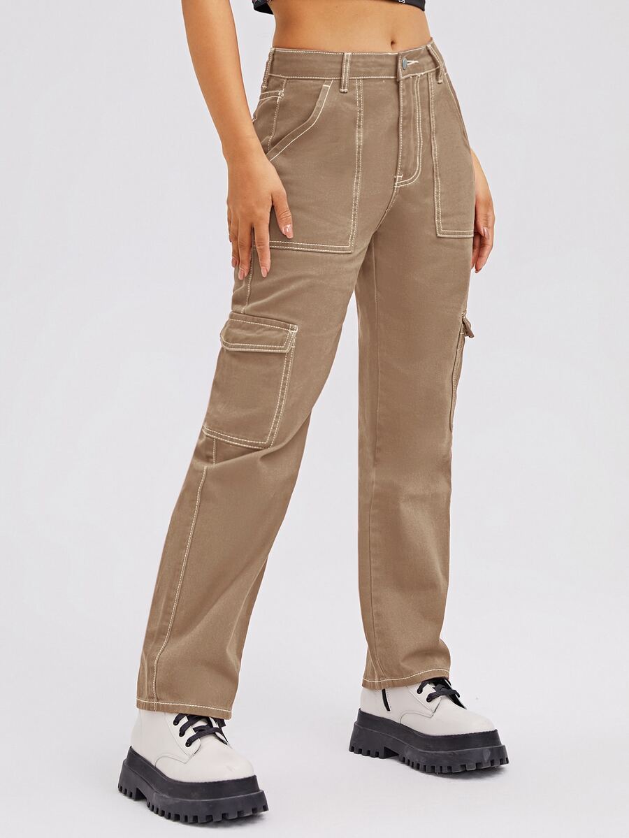 High Waist Flap Pocket Whip Stitch Cargo Jeans