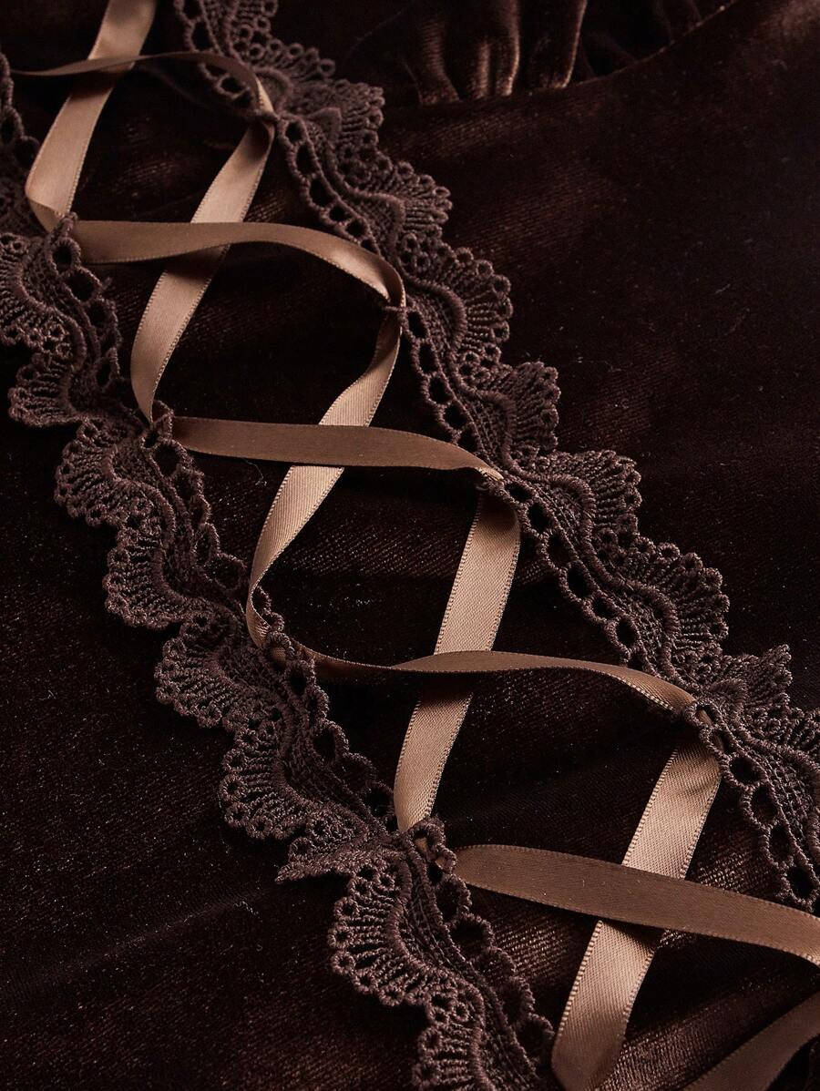 Hippie Lace Up Front Frill Trim Velvet Tee