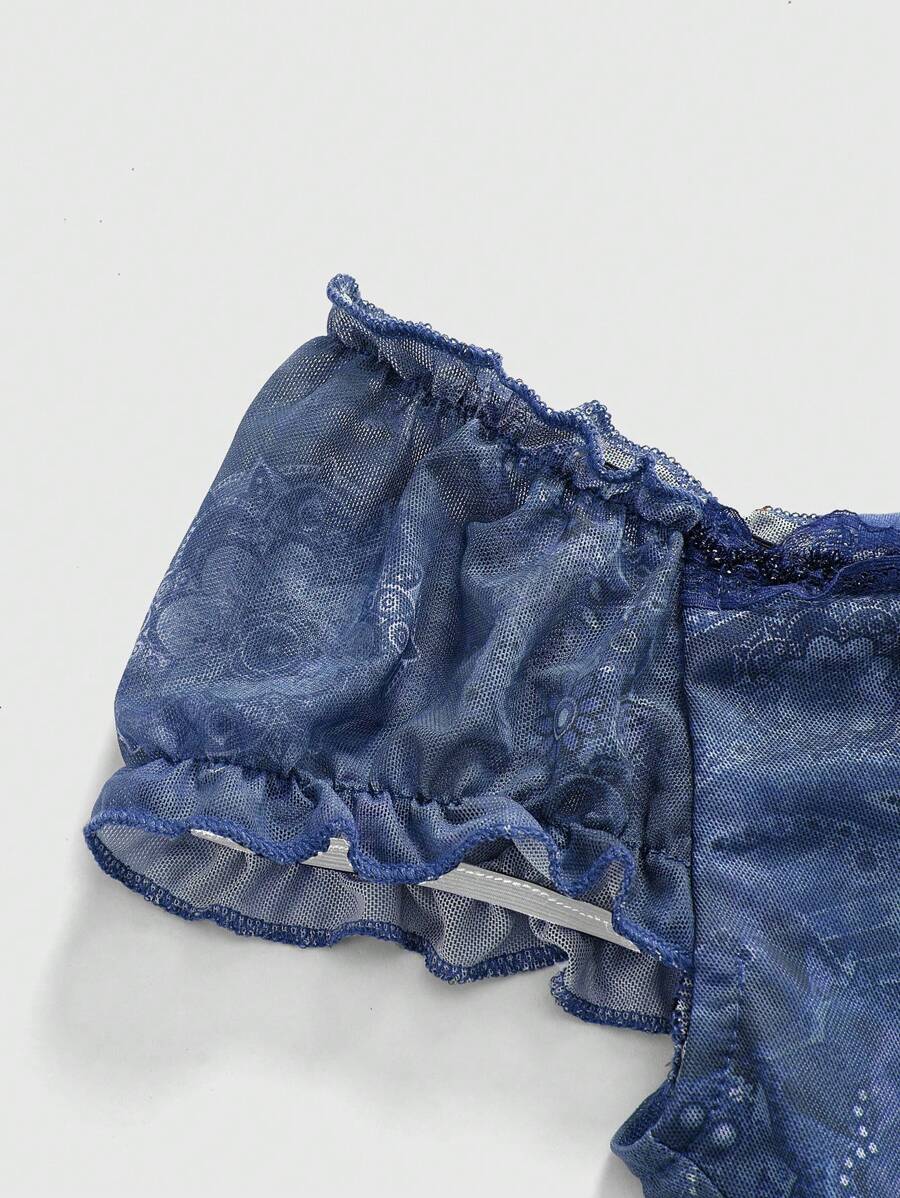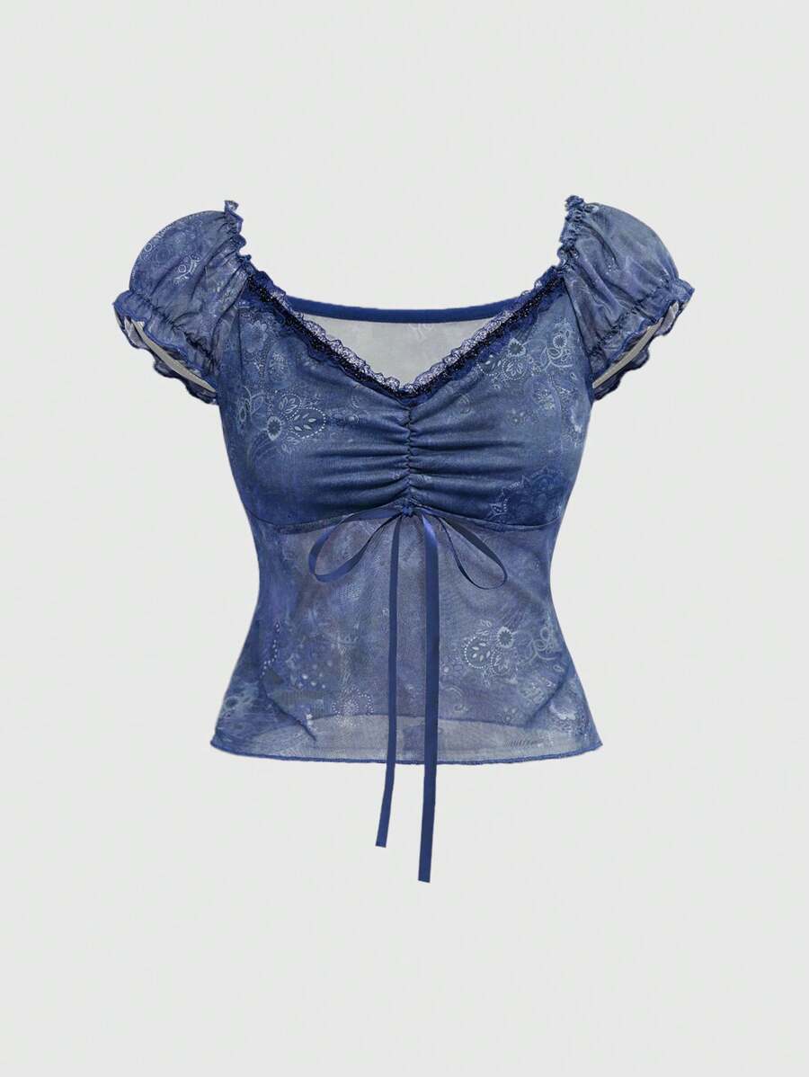 Retro Hippie V-Neck Bowknot Accent Contrast Ditsy Floral Women T-Shirt, Slim Flattering And Versatile