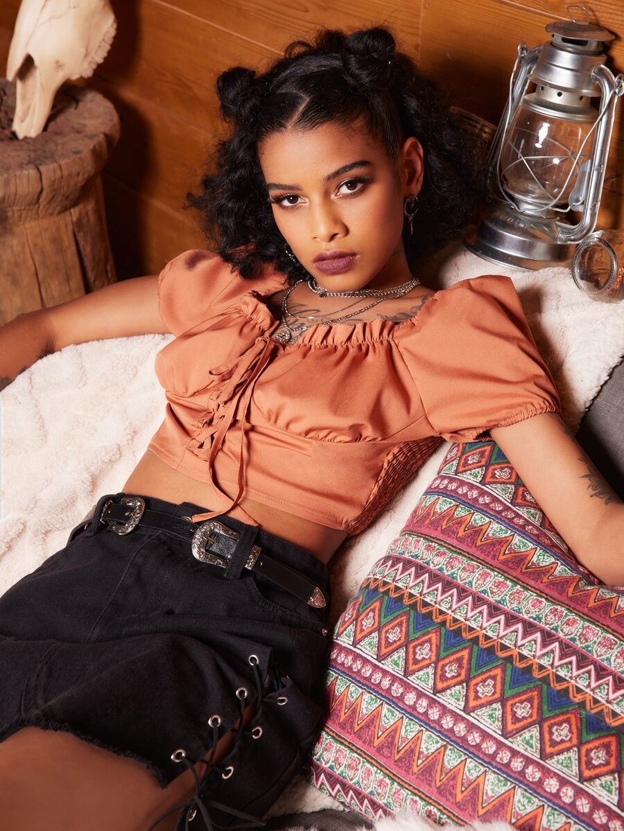 Hippie Solid Lace Up Ruched Bust Shirred Blouse