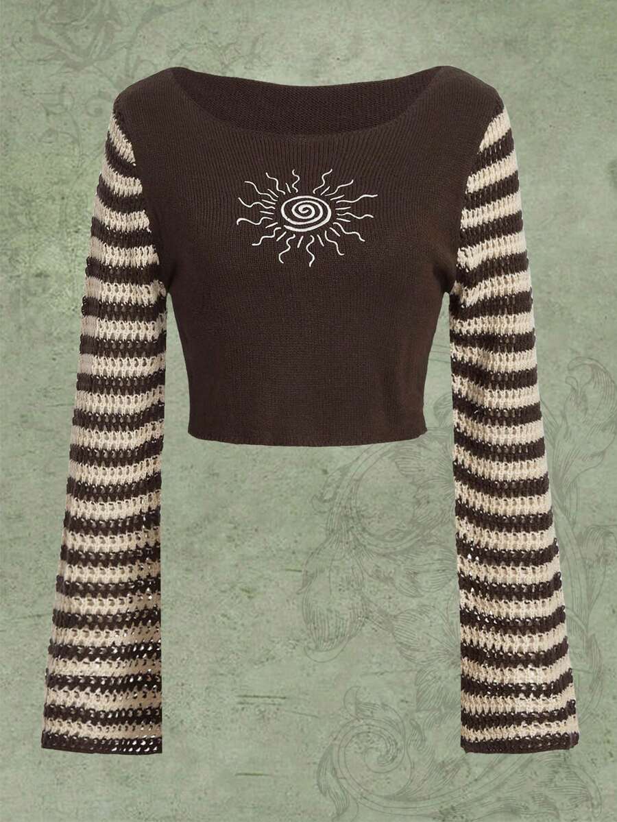 Hippie Striped & Sun Pattern Bell Sleeve Crop Jumper