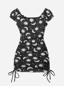 Hippie Sun & Moon Graphic Drawstring Ruched Dress