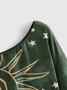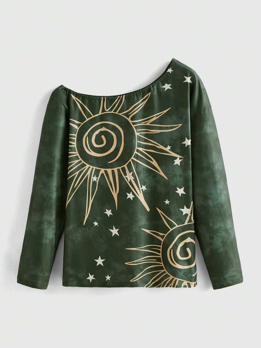 Hippie Sun & Star Print Tie Dye Asymmetrical Neck Tee
