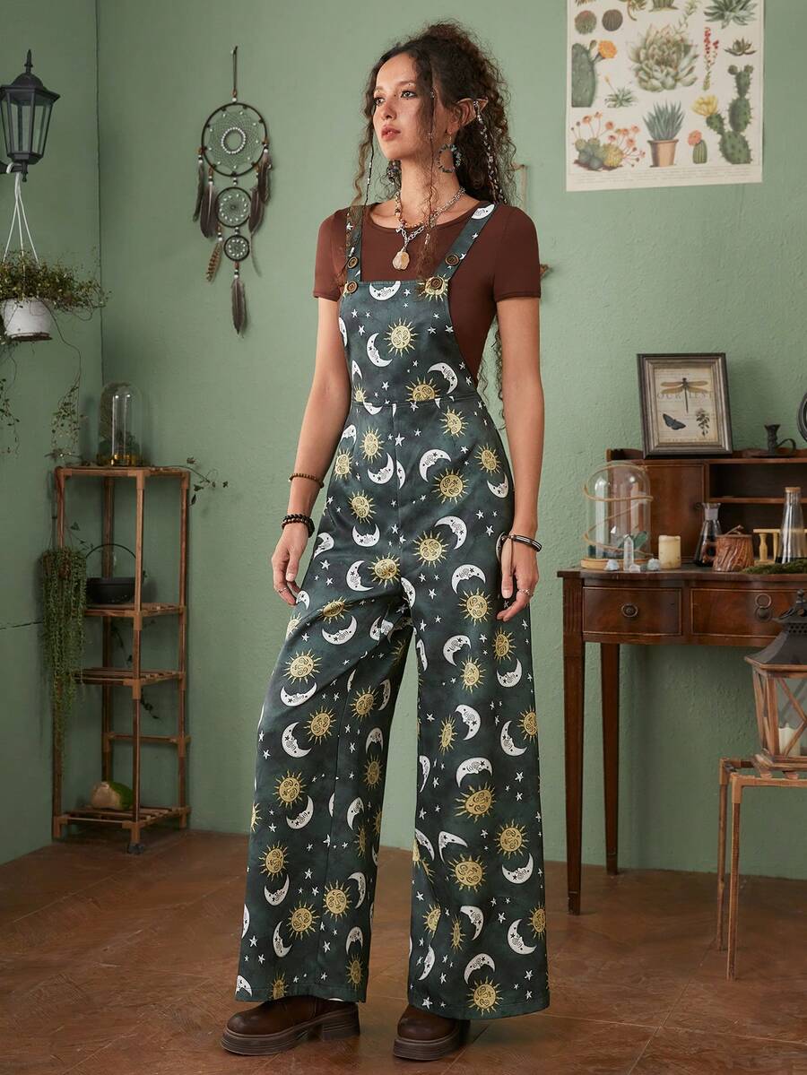 Hippie Tie Dye Sun & Moon Graphic Overall Jumpsuit