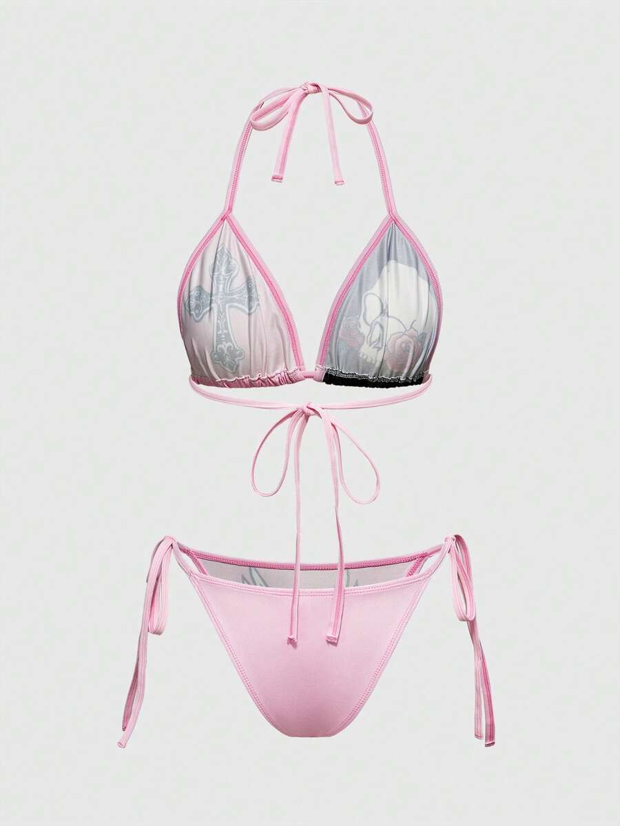 J-Fashion 3pcs Y2K Goth Rose Skull Cross Color Blocking Bikini Set, Wireless Lace-Up Sexy Women Lingerie Set