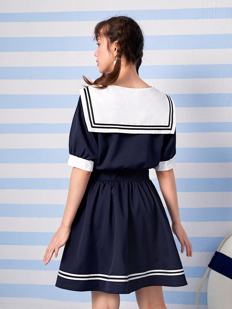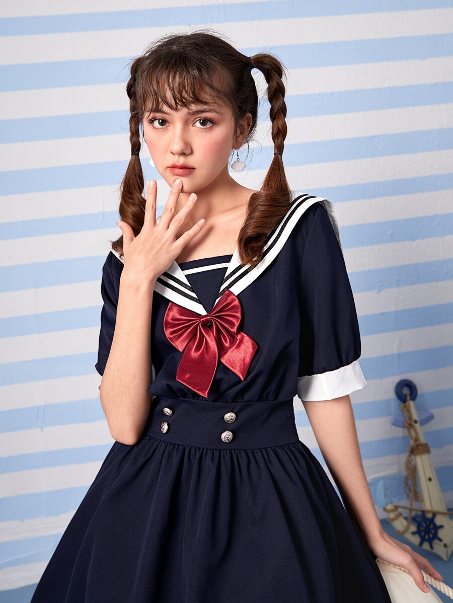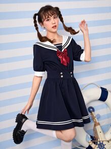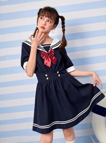 J-Fashion Sailor Collar Bow Front Striped Trim Dress