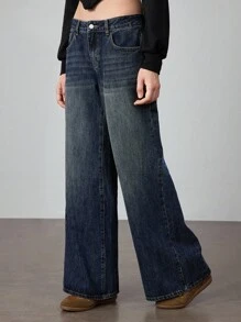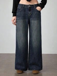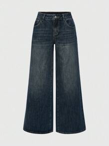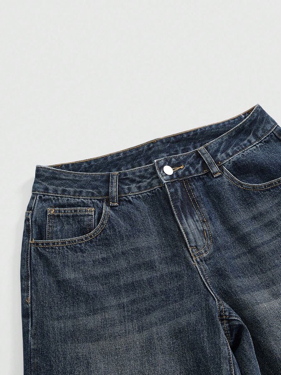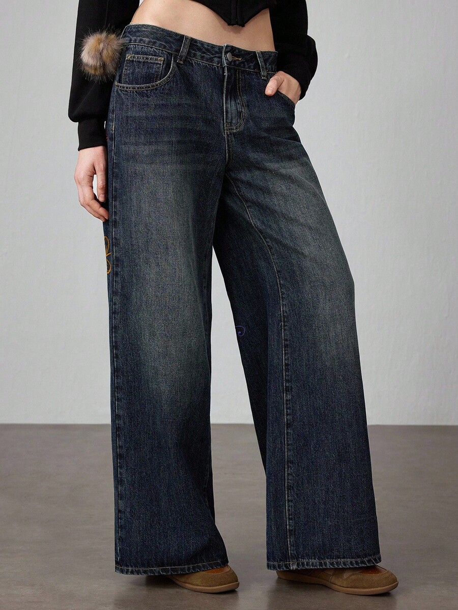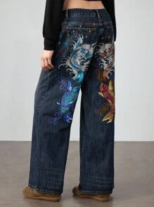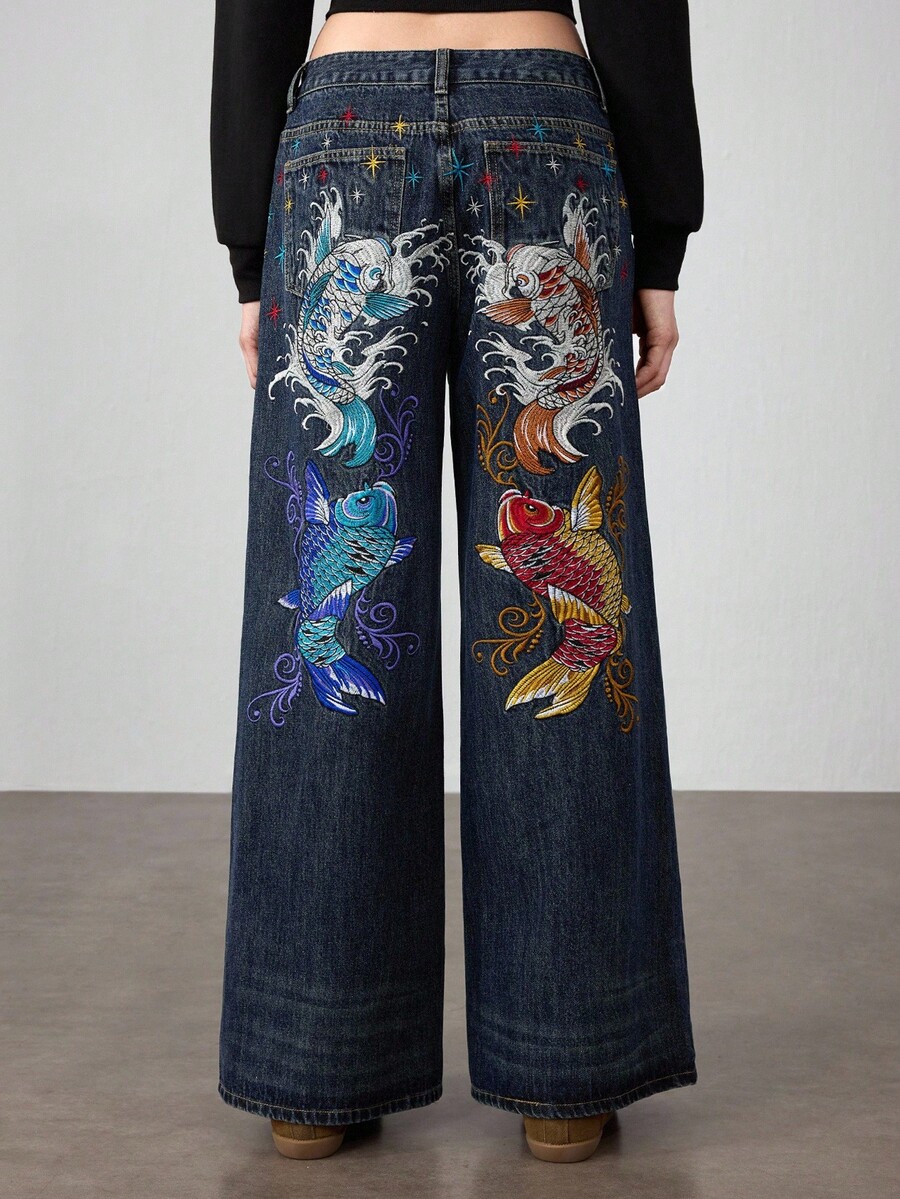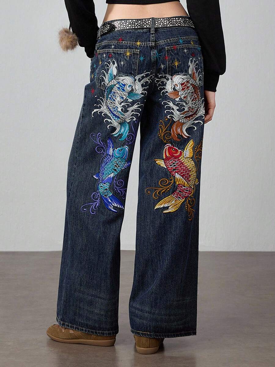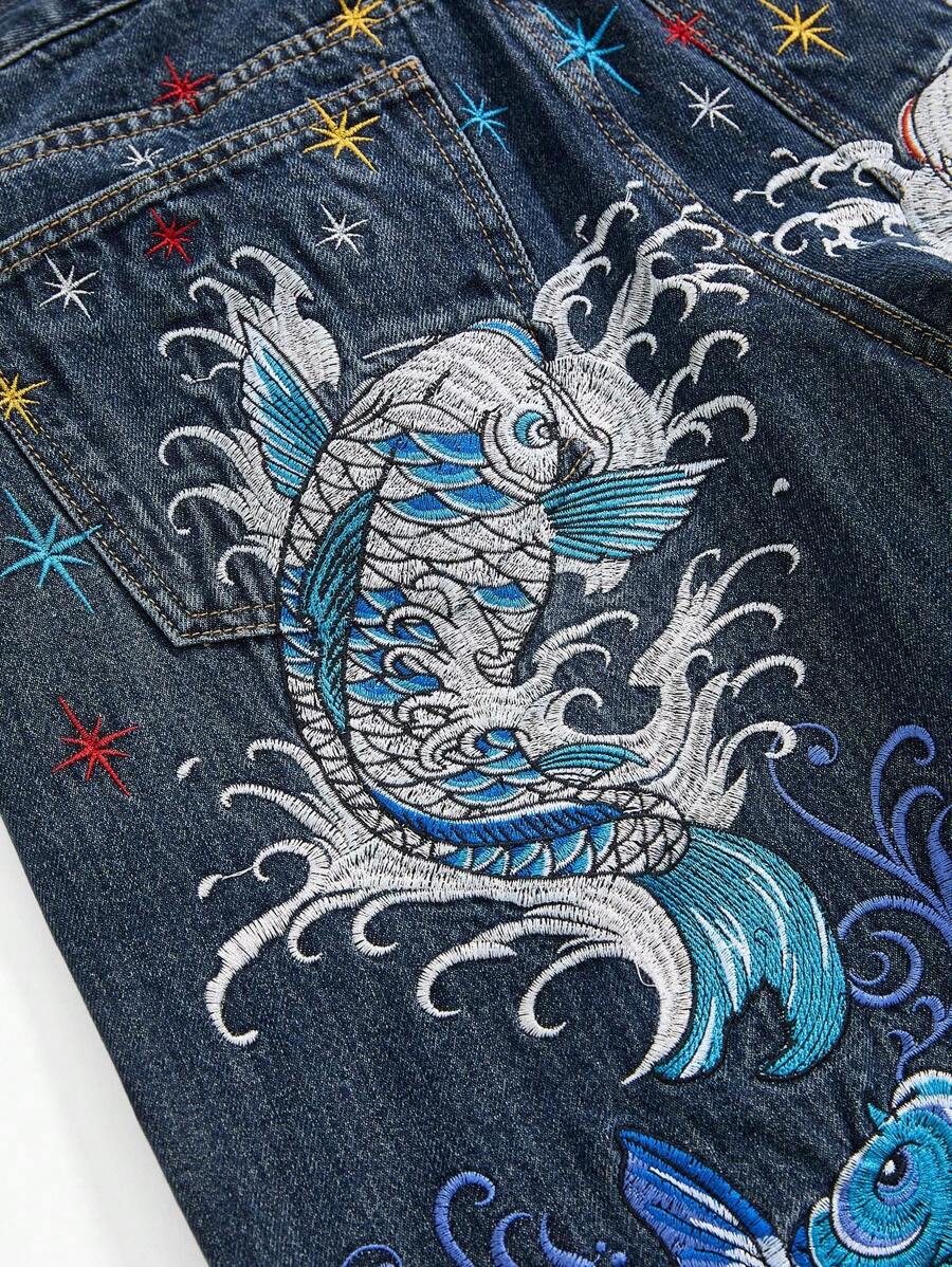 J-Fashion Unisex Retro Hip Hop Subculture Carp Floral Embroidery Loose Wide-Leg Low Waist Jeans