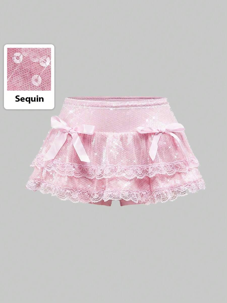 J-Fashion Women Gyaru Pink Contrast Sequins Layered Skirts