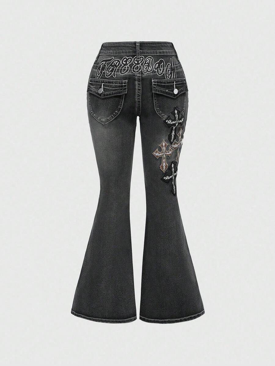 J-Fashion Women's Cross & Letter Embroidered Super Low Waist Flare Jeans