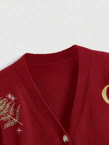 J-Fashion Women's Plant & Moon Embroidery Single-Breasted Casual Loose Cardigan With Drop Shoulders, Long Sleeve