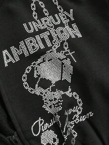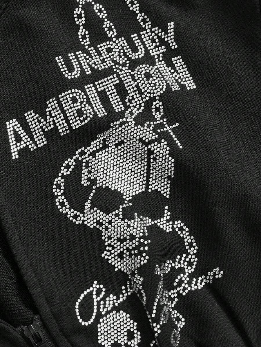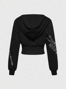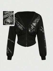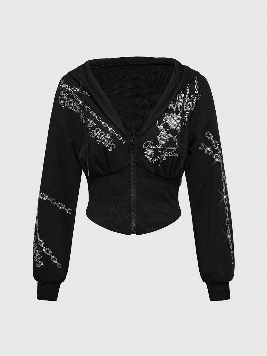 J-Fashion Women's Retro Y2K Subculture Chain Skull Letter Rhinestone Hoodie Sweatshirt With Cinched Waist