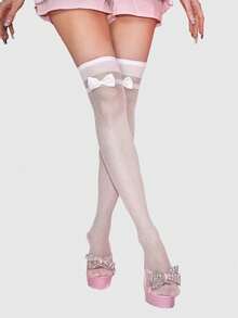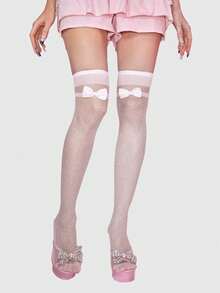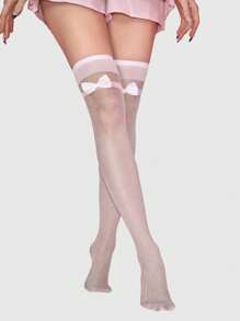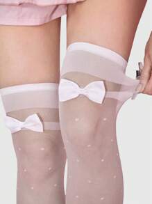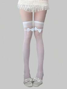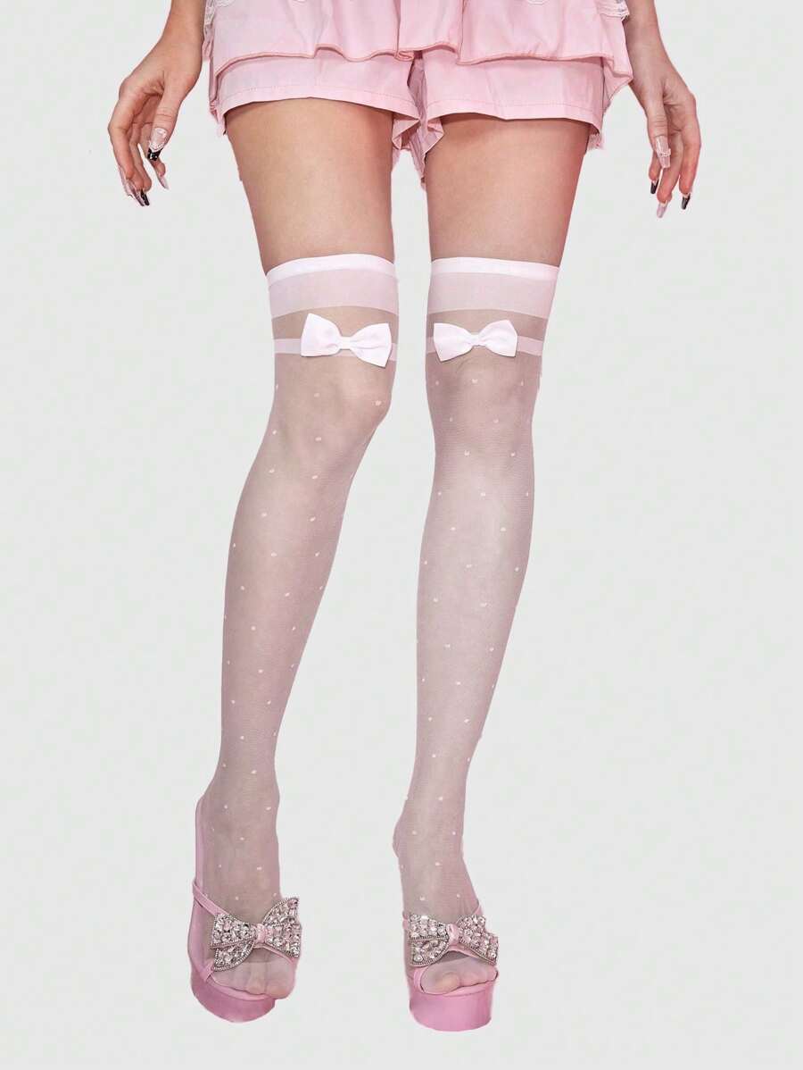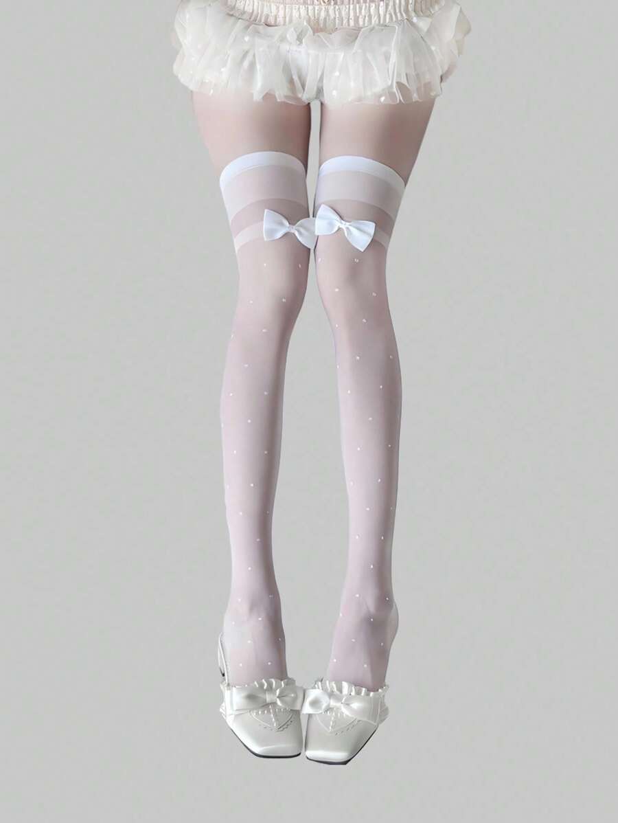 Kawaii 1 Pair Cute Polka Dot Pattern Bow Over-The-Knee Socks, Minimalist Style White Solid Color Fishnet Socks, Daily Ultra-Thin Elastic Sheer Tights