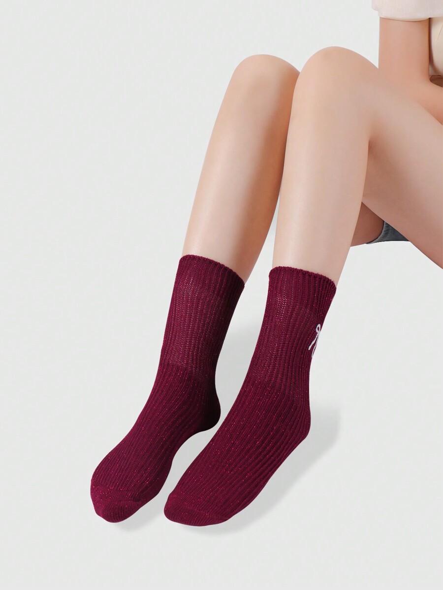 Kawaii 1 Pair Soft & Warm Korean Style High-End Fashion Angel Red Glitter Bow Decor Mid-Calf Socks, Suitable For Women And Girls Daily Wear, Beautifully Packaged Gift