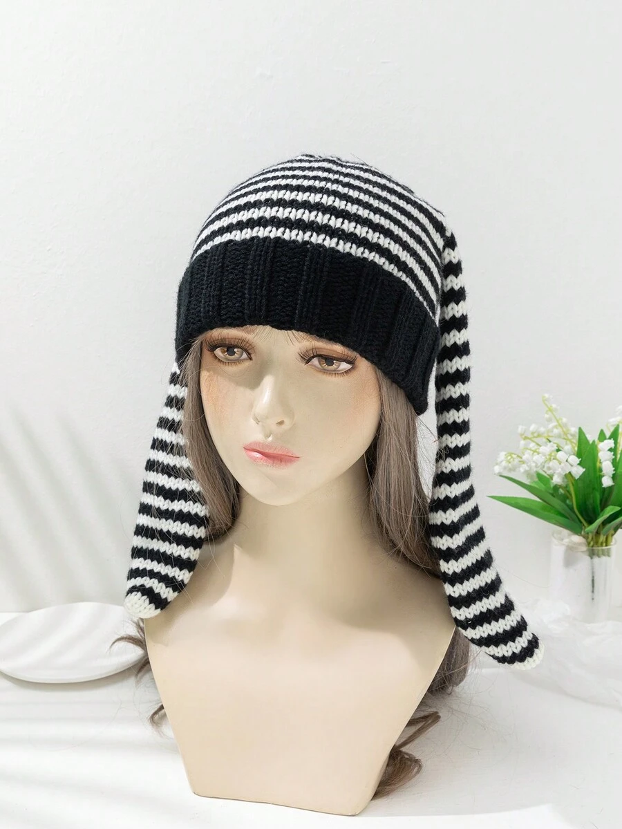 Kawaii 1 Women's Black And White Striped Braided Long Ears Knitted Hat Cute Thickened Warm Beanie
