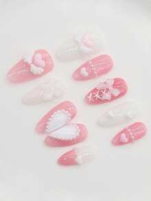 Kawaii 10pcs Cute Heart Pearl Wing Bow Handpainted Nail Stickers + 3pcs Double-Sided Adhesive, Removable & Reusable Pearl Contrast Color Handpainted Nail Art Stickers, Suitable For Holidays, Parties, Dancing And Daily Wear