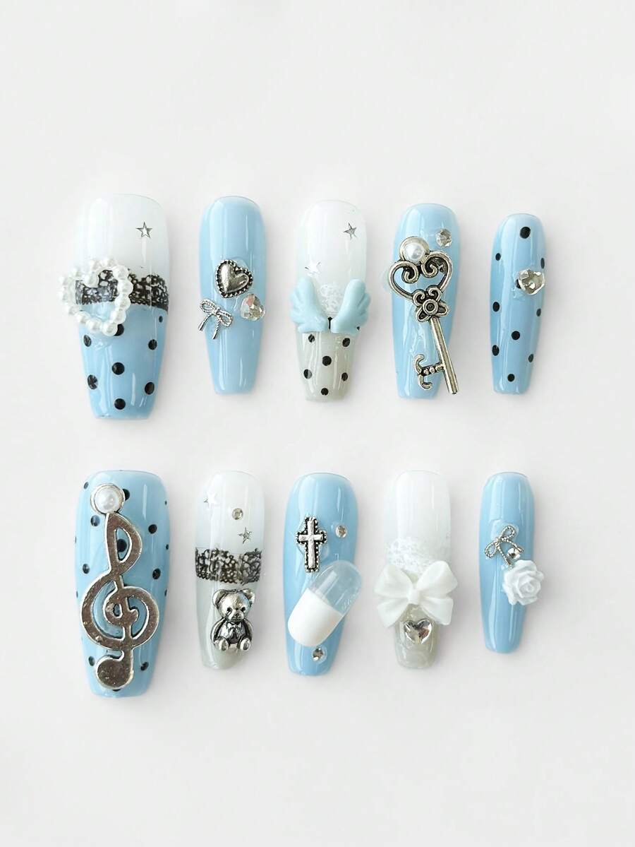 Kawaii 10pcs Cute Wing, Music Note, Star Lace Edged Polka Dot Handpainted High-Quality False Nails + 3pcs Double-Sided Adhesive, Removable & Reusable Coffin Shaped Fake Nails, Bowknot Element Nail Stickers, Suitable For Holidays, Parties, Dancing And Daily Wear