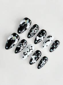 Kawaii 10pcs Dark Style Wings, Stars, Bow, Music Note Decor High-Quality Handmade False Nails + 3pcs Double-Sided Adhesive, Y2K Blue Polka Dot Removable Nail Art Stickers, Suitable For Festivals, Parties, Dancing And Daily Wear
