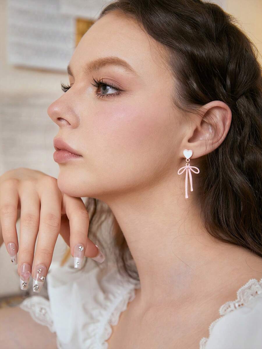 Kawaii 1pair Fashion Zinc Alloy Heart & Bow Drop Earrings For Women For Daily Decoration Valentines