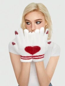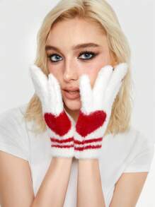 Kawaii 1pair Women's Winter Knitted Plush Touchscreen Gloves With Red Heart Shape
