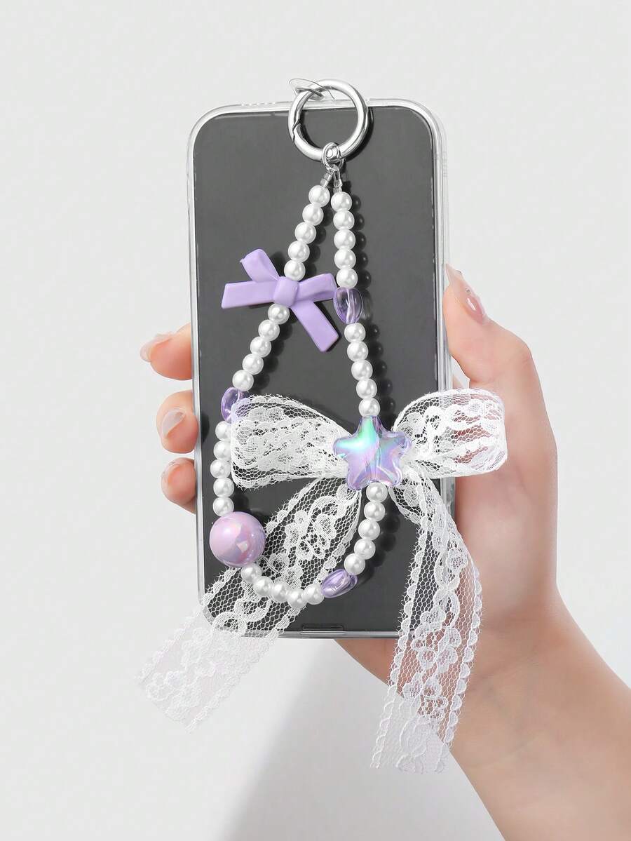 Kawaii 1pc INS Elegant Sweet Cute Versatile High-Quality Handmade Beaded Faux Pearl Purple Heart Star Bear Acrylic Mesh Velvet Bow Braided Rope Key Chain Phone Charm, Suitable For Women, Daily Wear, Holiday Gift