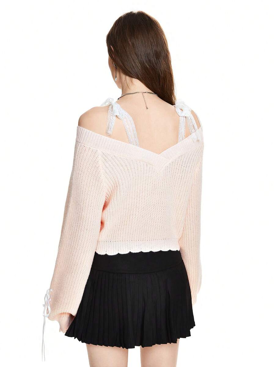 Kawaii 1pc Off-Shoulder Tie Strap Cute Cat Print Sweater For Women