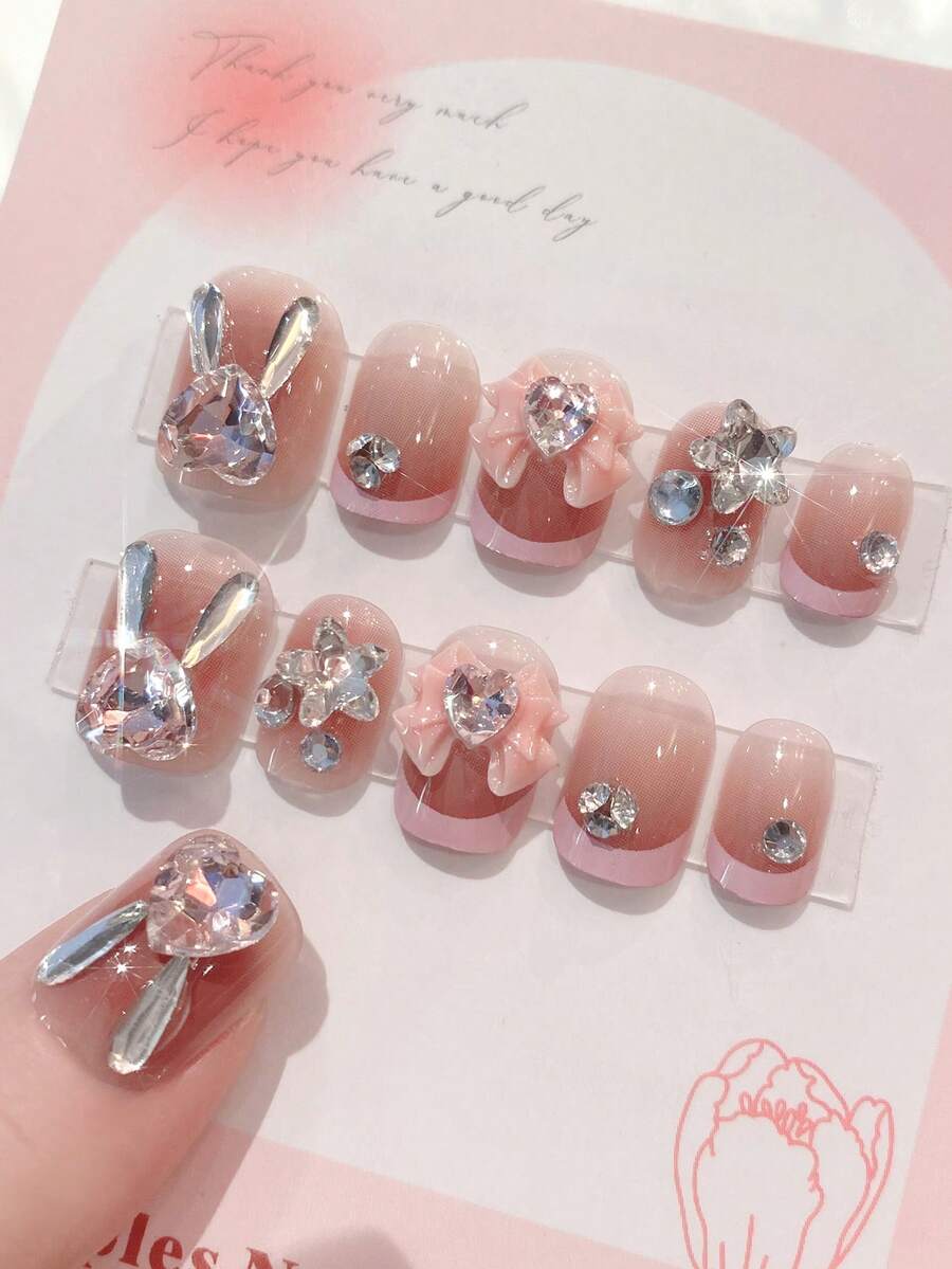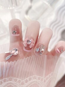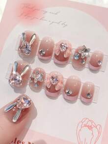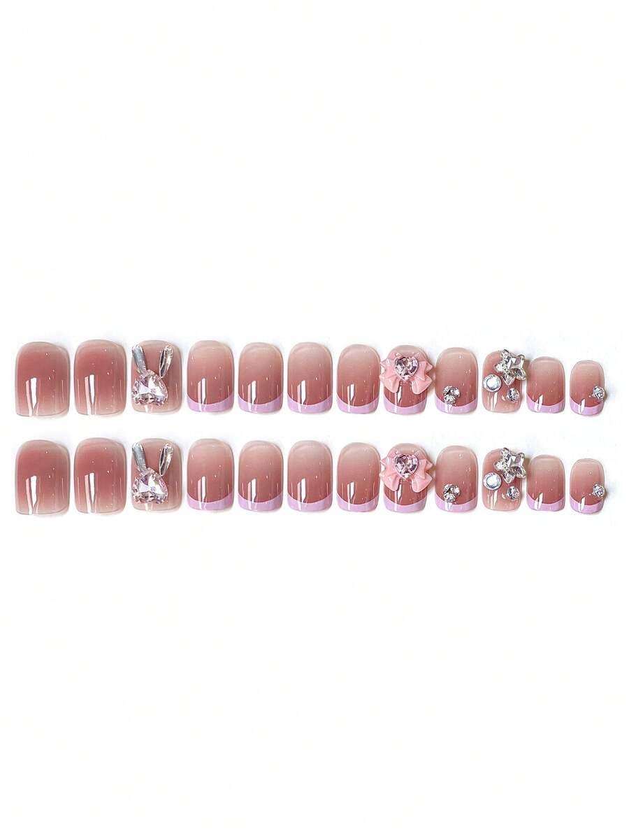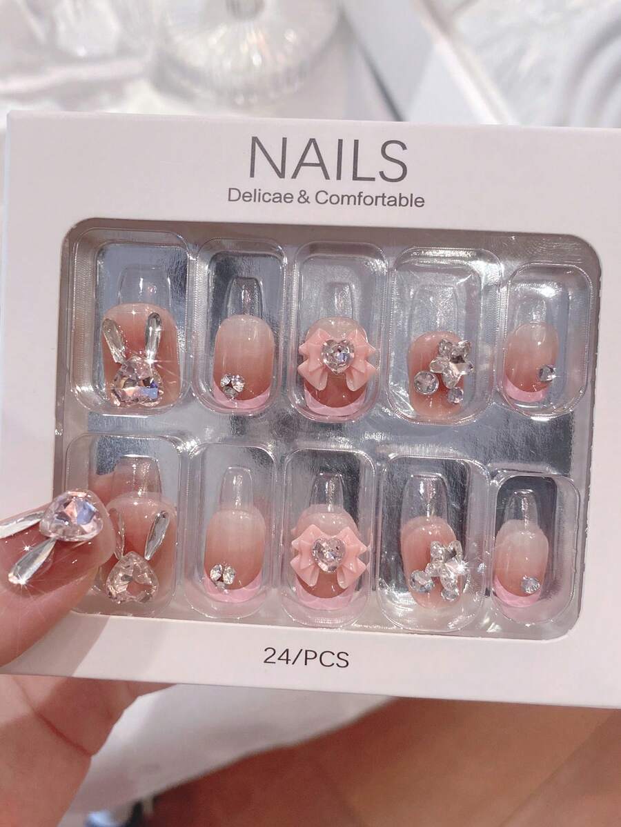 Kawaii 24pcs Shorts Square 3D Rhinestone Decor Fake Nail & 1sheet Tape