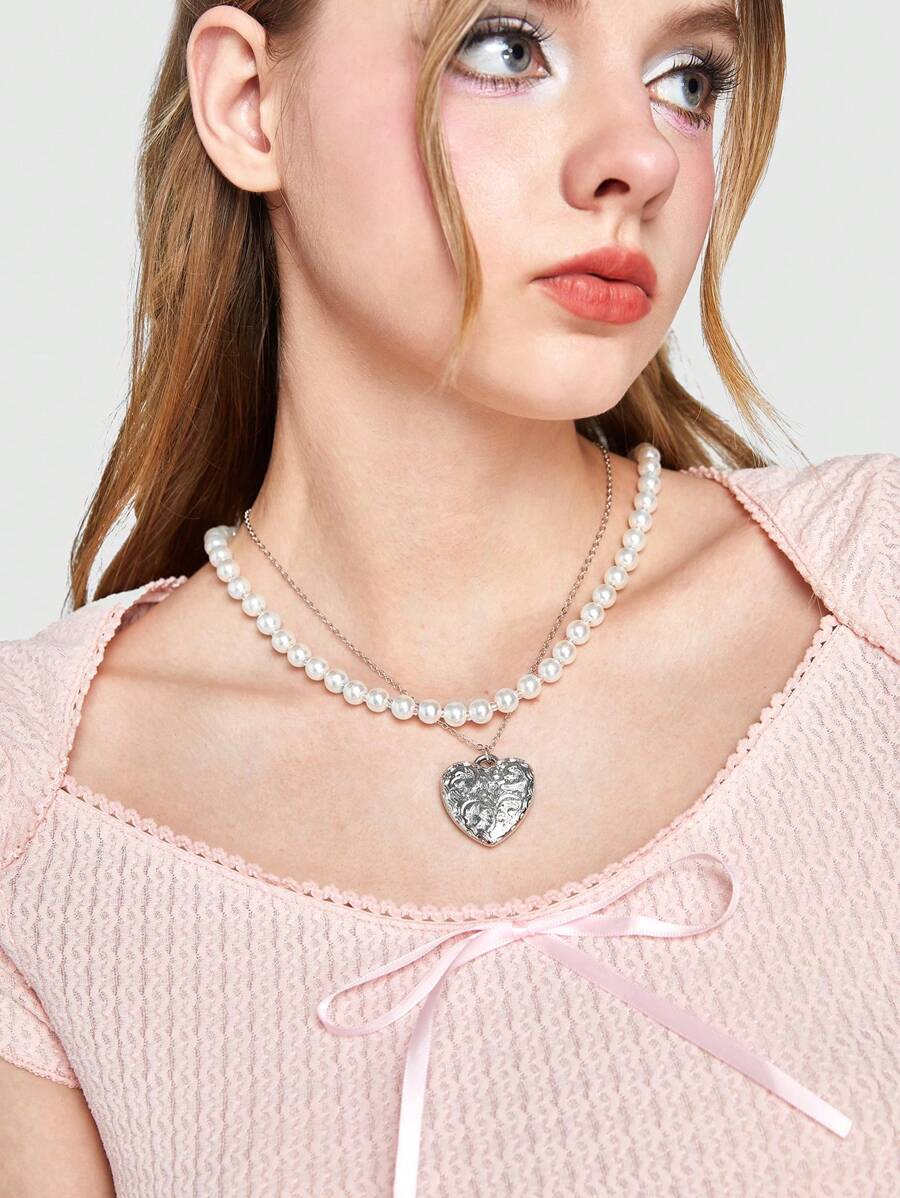Kawaii 2pcs Elegant Copper Alloy Heart Charm Faux Pearl Beaded Necklace For Women For Daily Decoration
