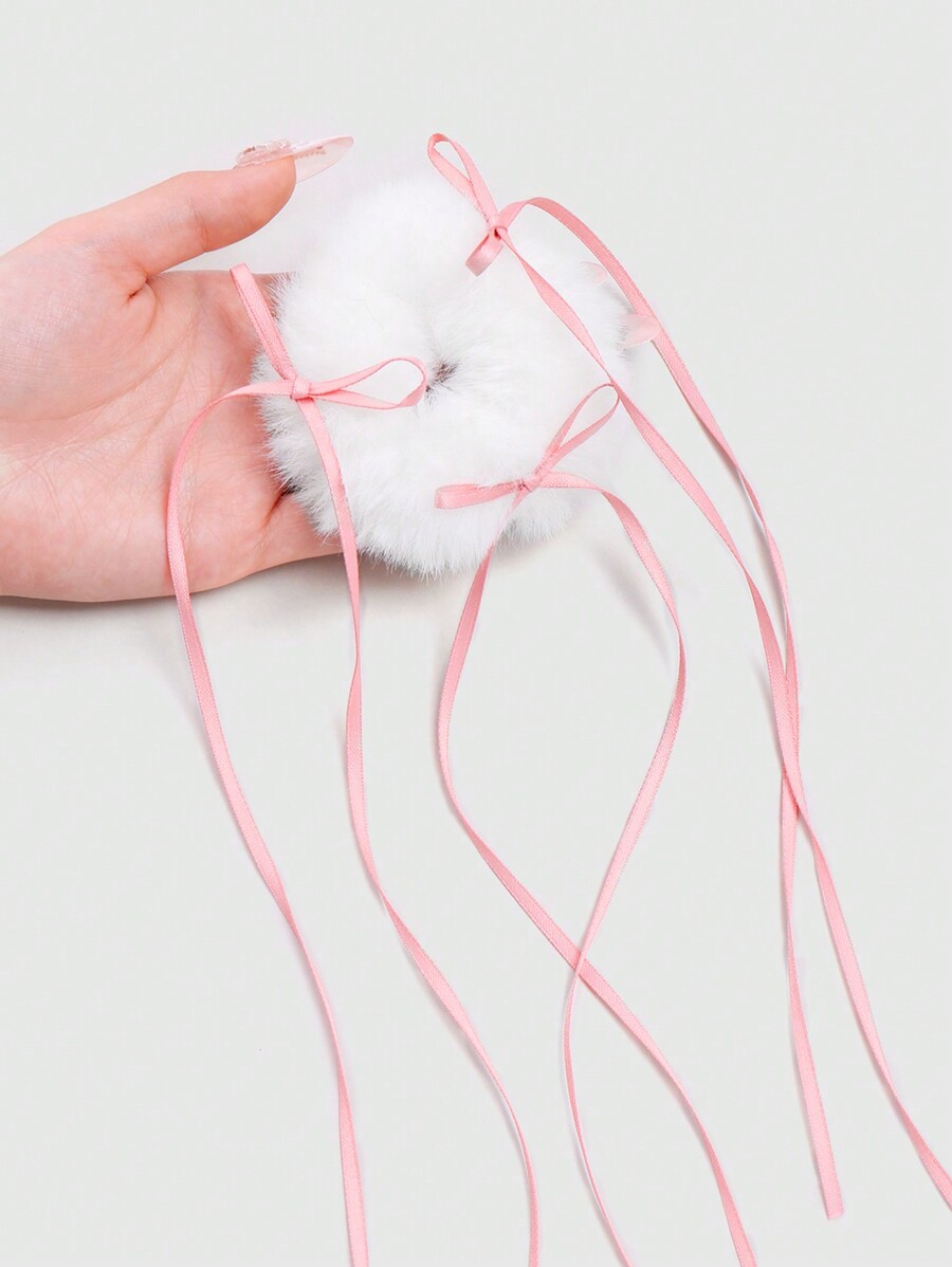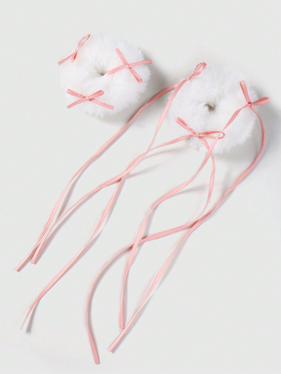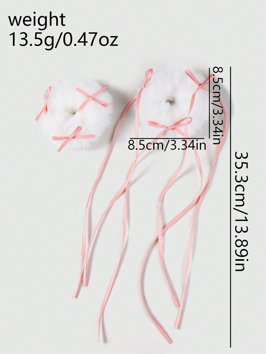 Kawaii 2pcs/Set INS Minimalistic & Cute Fitted Fur Scrunchies With Bow Elastic Hair Ties, Suitable For Girls, Women, Friends, Daily Wear Or Gifts, Autumn/Winter
