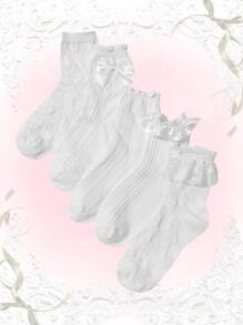 Kawaii 5pairs Bow Decor Ruffle Trim Crew Socks