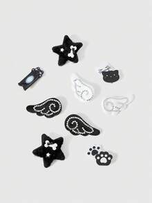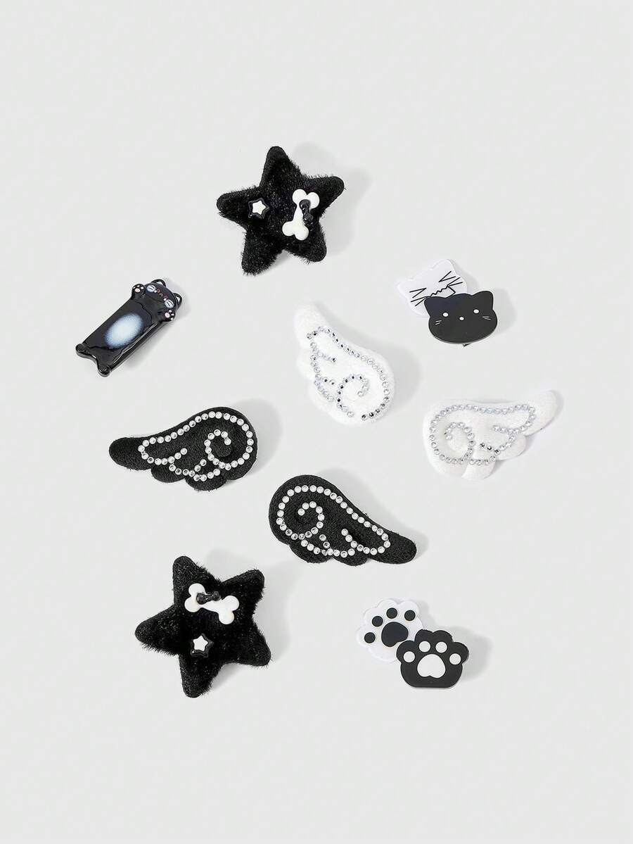 Kawaii 9 Random Cute Handmade Wing Hairpins, Black And White Plush Rhinestone Hairpin Combination, Lolita Multi-Piece Hair Accessories Set Combination.